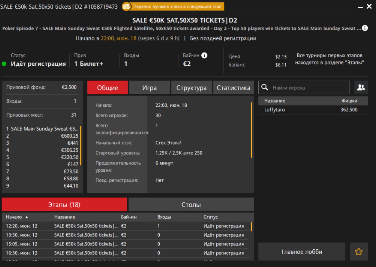 При бай-ине в €2 этот сат гарантировал 50 билетов за €50, при этом флайты шли полную неделю и Day 2 заканчивался незадолго до старта Мейна.