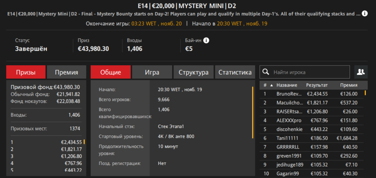 Так, €5 Mystery Mini €20K Gtd привлёк 9,666 входов, перекрыв гарантию на €23,980. Самый крупный баунти €3,971 достался «Undreaner322», а победителем стал «BrunoRevoltss» — он получил €2,434 призовыми + €126 баунти.