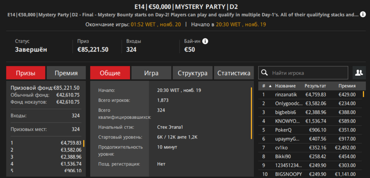 €50 Mystery Party €50K Gtd собрал 1,873 входа и на €35,221 больше гарантии. Самый крупный баунти €8,543 получил «RICHREICH», победителем же стал игрок из России Ринат «rinzanatik» Ибрагимов — ему досталось €4,759 призовыми и €429 баунти.