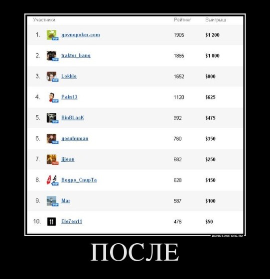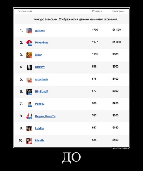 Да, да, да к Траке с Охми, за их перепалку в последний день. Ребят представьте на одной чаше весов первое место и какие-то 200 баксов, на другой второе место, причем проигрыш в очень упорной борьбе, но при первом варианте вы еще теряете хорошие отношения с оппонентом, а заодно возможно и выставляете себя не в лучшем свете перед тысячами фанатов, что важнее?