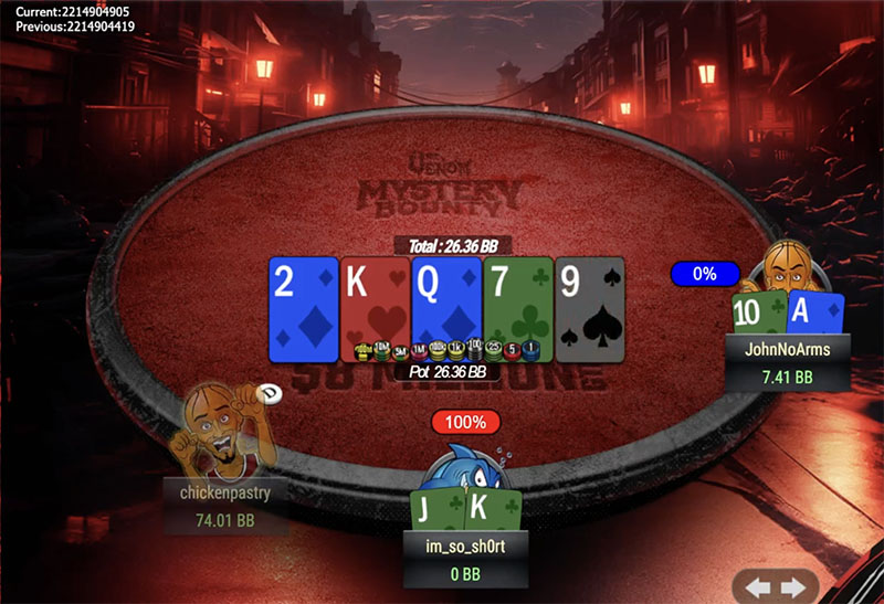 В финальной для себя раздаче Артур со стеком 12,5 бб защитил BB. На флопе сыграл чек — клик-рейз, на тёрне оба игрока сыграли чек, на ривере Артур поставил олл-ин.