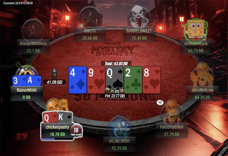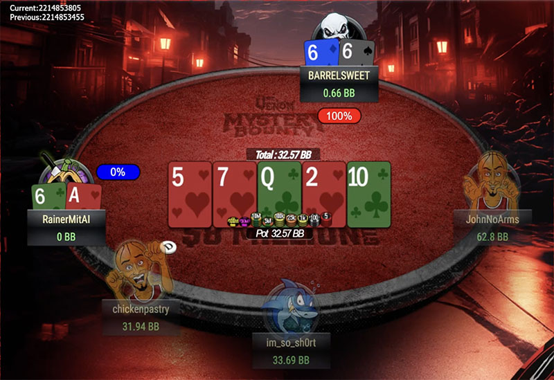 Леонард «RainerMitAI» Мауэ выставился с А6о против BARRELSWEET с 66 по 16 бб — тёрн дал флеш-дро, но ни туз, ни ещё одна червовая карта на ривере не пришла.
