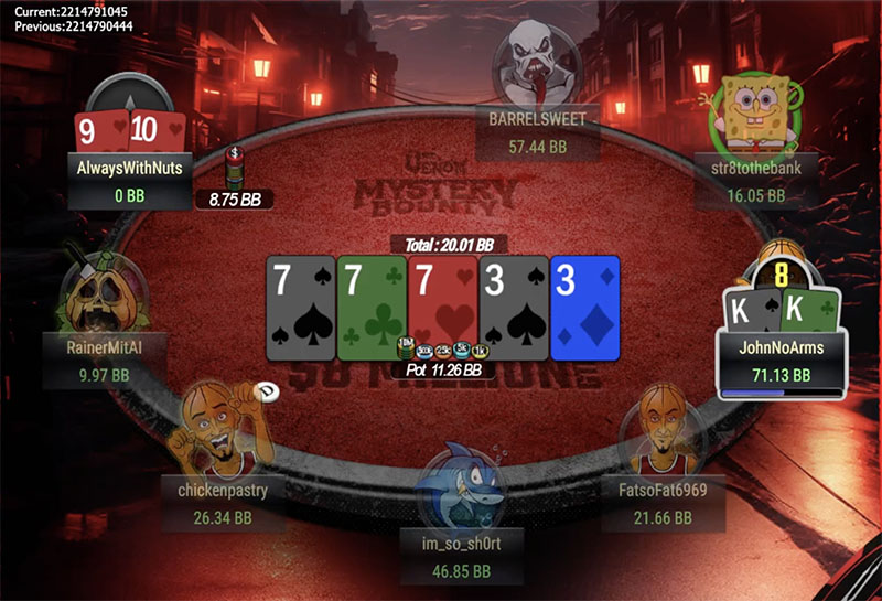 Venom PLO, возможно, установил рекорд по глубине игры за финальным столом. Самым коротким в 7-max вышел норвежец BalaGarba14 с 66 бб, лидировал венгр omahafyrarolls с 366 бб. Средний стек = 189 бб.