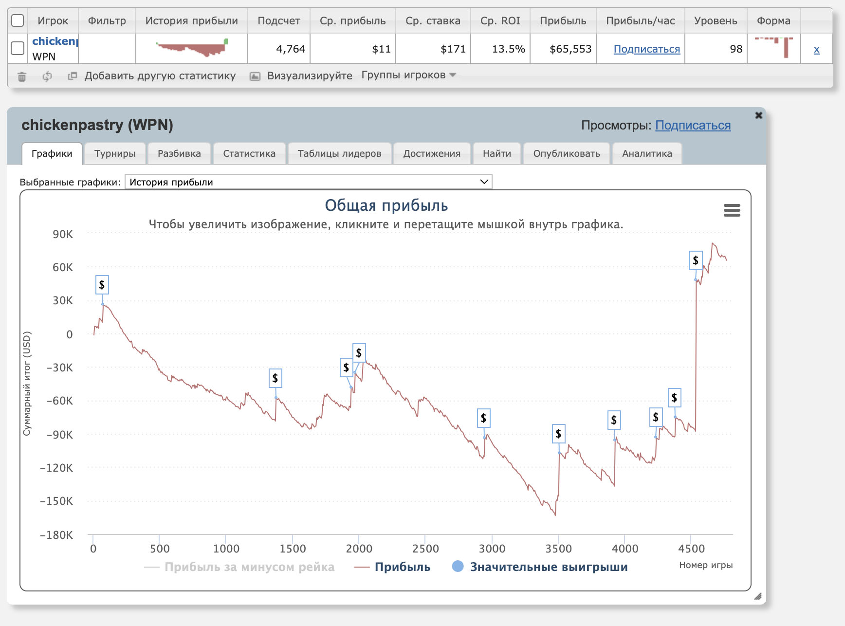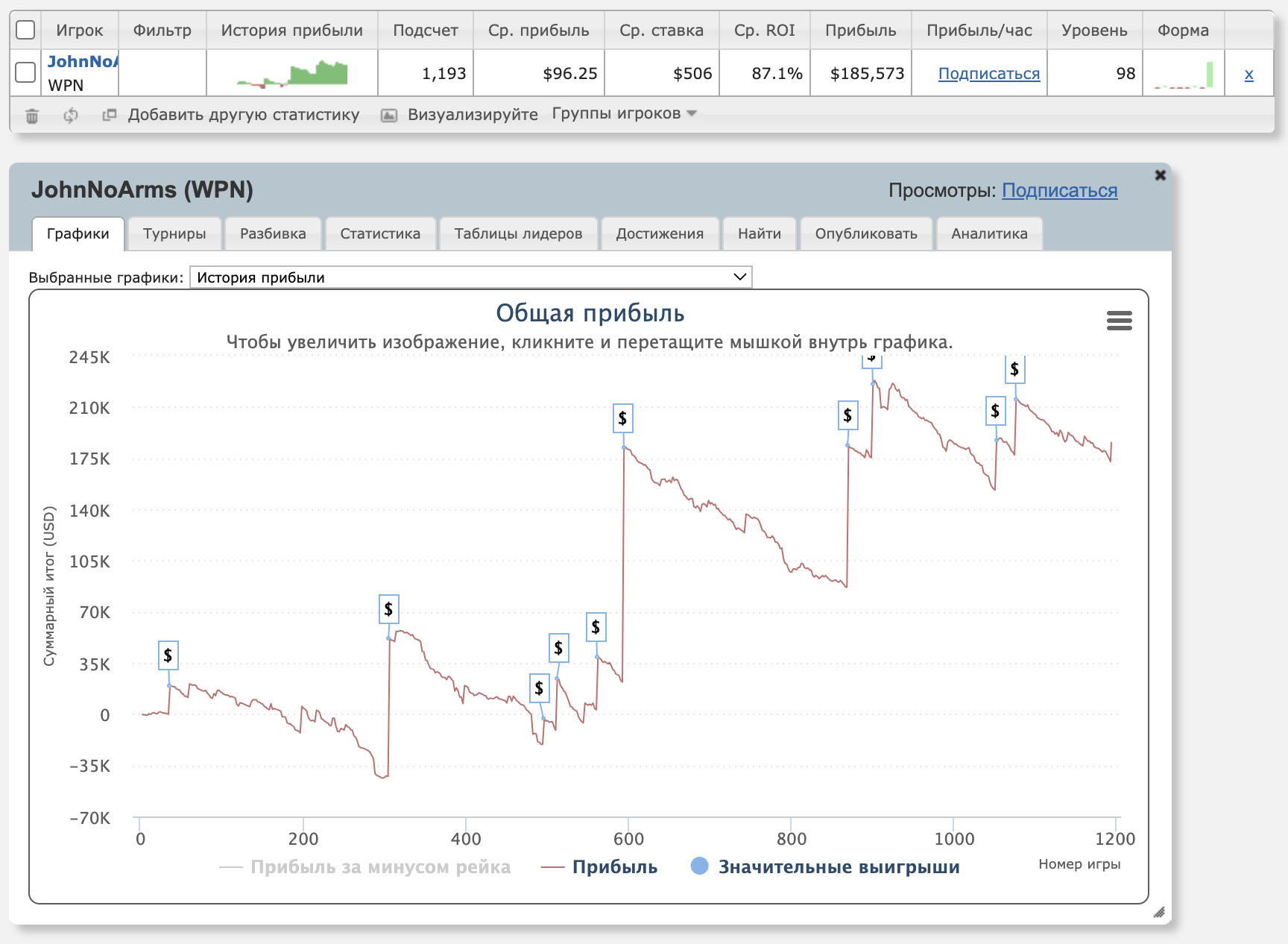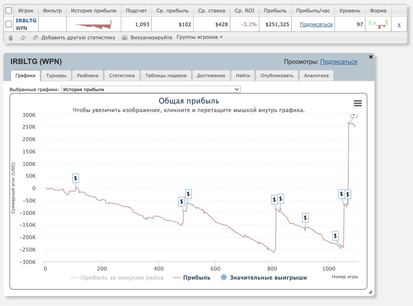 IRBLTG играет на PokerKing с 2020 года. С мая 2024 года он оформил более $490K призовых без учёта доезда в Веноме.