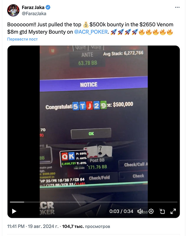 Главная интрига турнира разрешилась во второй игровой день. Фараз «The-Toilet 0» Джака (Faraz Jaka) выиграл рекордный баунти в $500K. Твит с раздачей, в которой Джака вытащил Mystery Bounty, собрала более 100К просмотров.