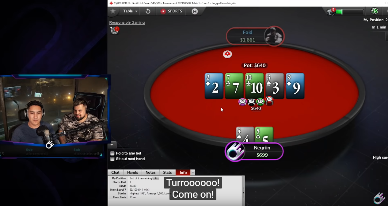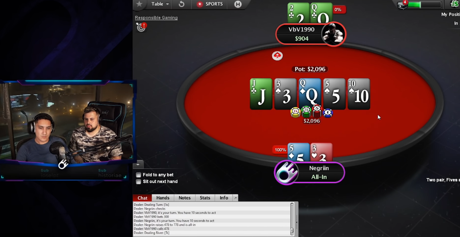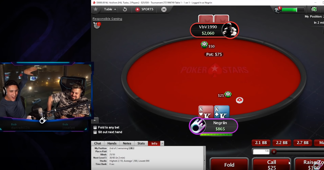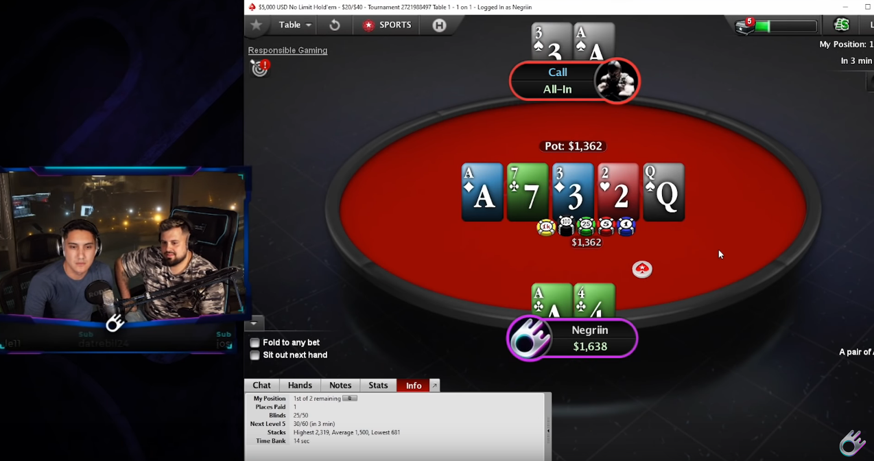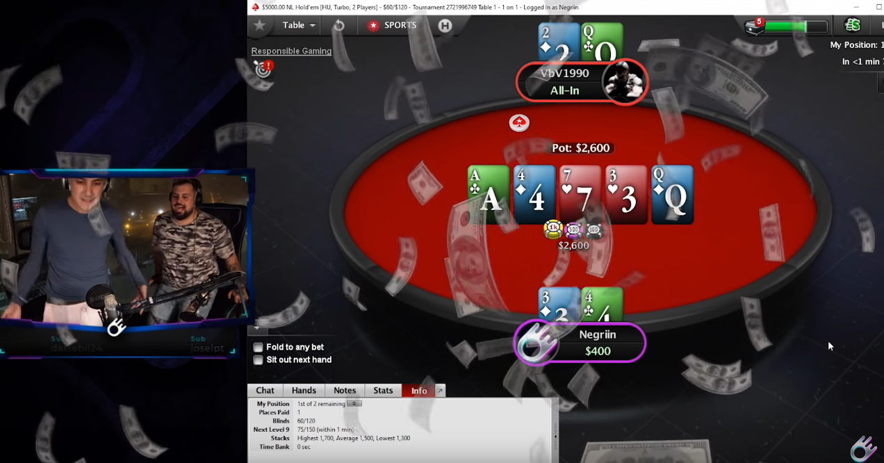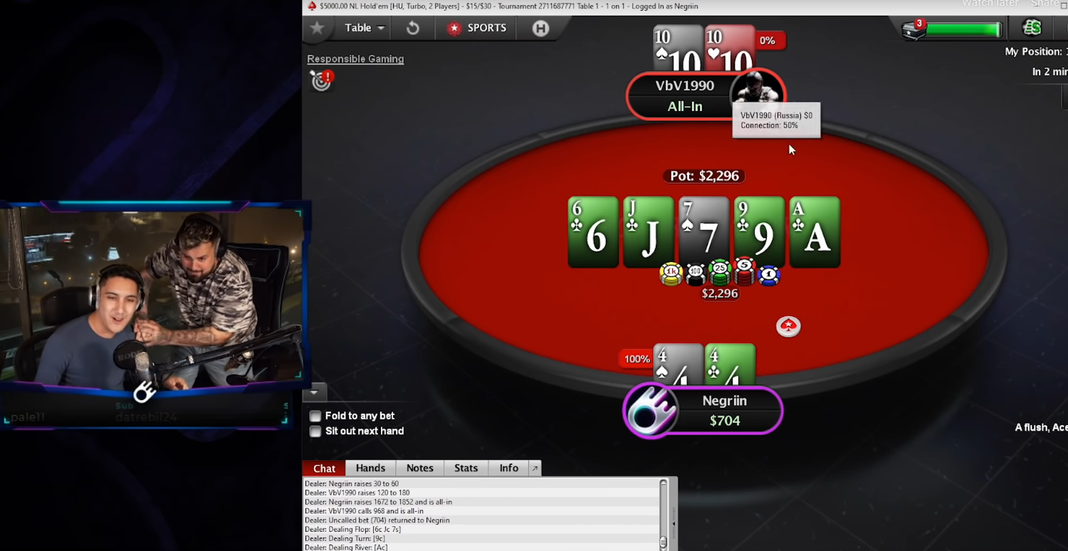 После этого удвоения, Иван додавил оппонента за пару минут. В последней раздаче он вскрыл блеф Вячеслава по третьей паре.