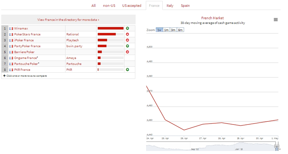 iPoker.FR тоже потенциально мог вступить в клуб «зелёных стрелочек», если бы не забастовка пользователей 2 недели назад. Пользователи из Франции потребовали исполнения обещаний обновления софта, а также жаловались на то, что иностранцам всё ещё позволено играть с ними. Winamax опять удалось получить лидерство над PokerStars, всего лишь из-за небольшого прироста трафика. Старзы же упали всего на 2%.