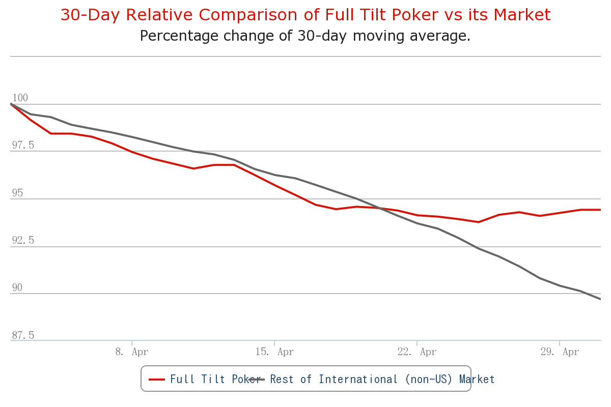 После грандиозного перезапуска под знамёнами компании Rational Group, FTP немедленно стал вторым лидирующим оператором на глобальном рынке, однако, эйфория пользователей быстро прошла и числа неумолимо стали обваливаться. Казалось бы, фулл тилт ничего не могут поделать с массовым уходом пользователей; но на этой неделе ситуация изменилась. Давайте сначала посмотрим на апрельский график:
