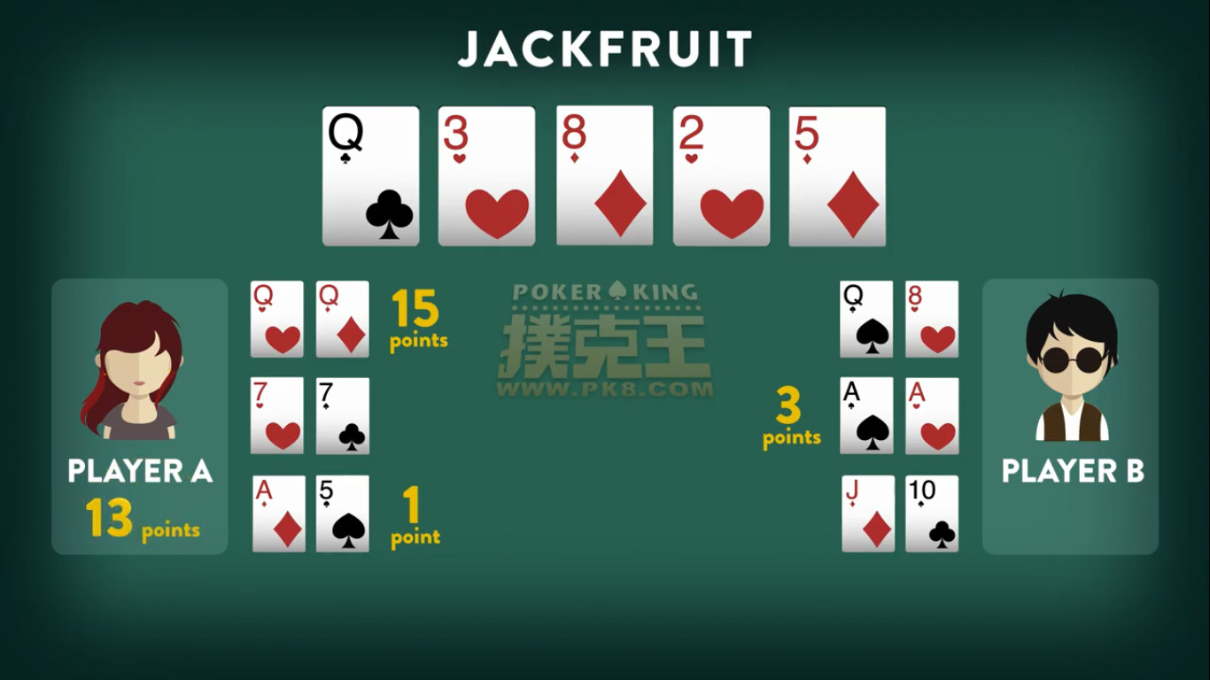 Джекфрут — интересная разновидность покера для домашней игры. Его легче освоить, чем Китайский покер. Раздачи проходят быстрее, чем в любой другой дисциплине. Подсчет очков прост и понятен. В Джекфрут можно играть без фишек, просто записывая очки как в преферанс или тысячу. Это классная дисциплина для знакомства новичков с покером (одновременно и с Холдемом, и с Китайским покером).