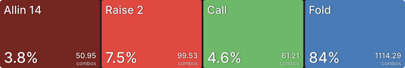 Самый интересный диапазон. Первое, на что нужно обратить внимание — диапазон немного расширился. В глубине 14bb мы разыгрываем 16% рук, в глубине 17bb — 15,8%.