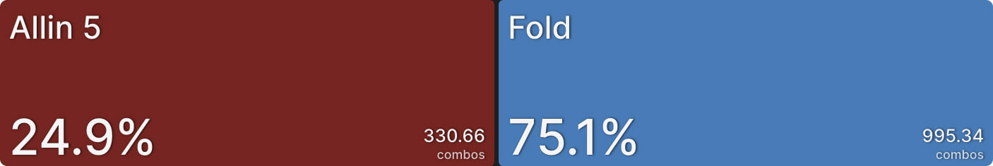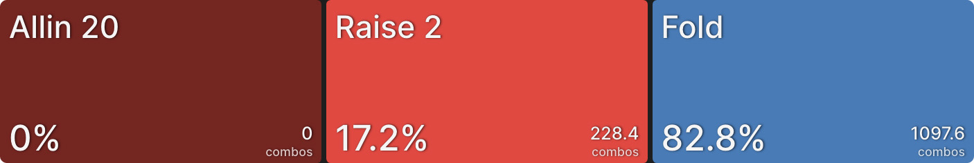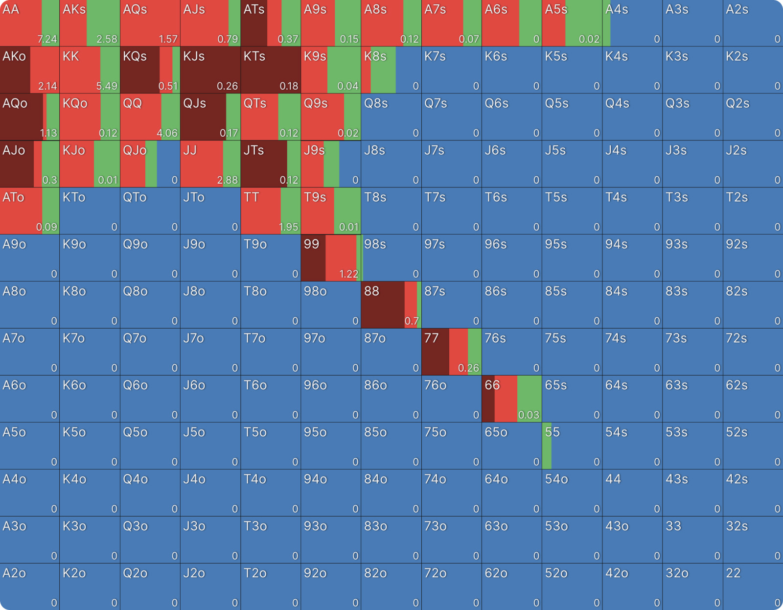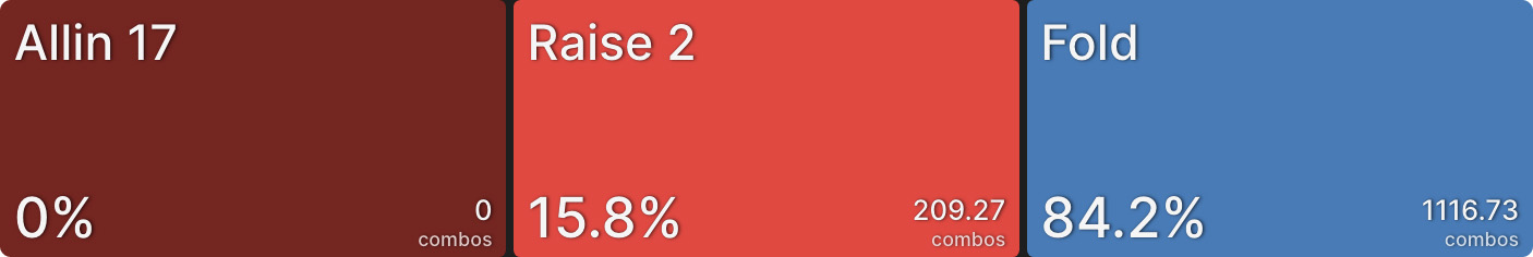 Если мы зададим солверу только стратегию рейзов, общий диапазон станет уже. Например, через лимп разыгрываются A4s, 55 и иногда 66. А4s и 55 не входили в диапазон для 17bb, а 66 разыгрывались не с полным весом.