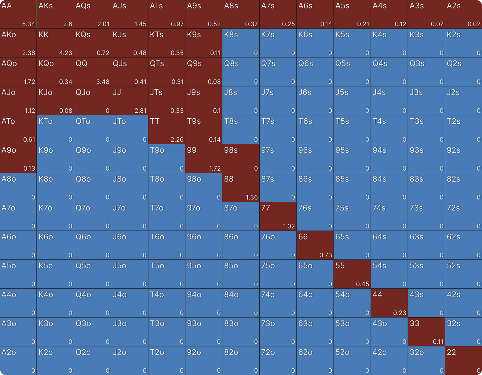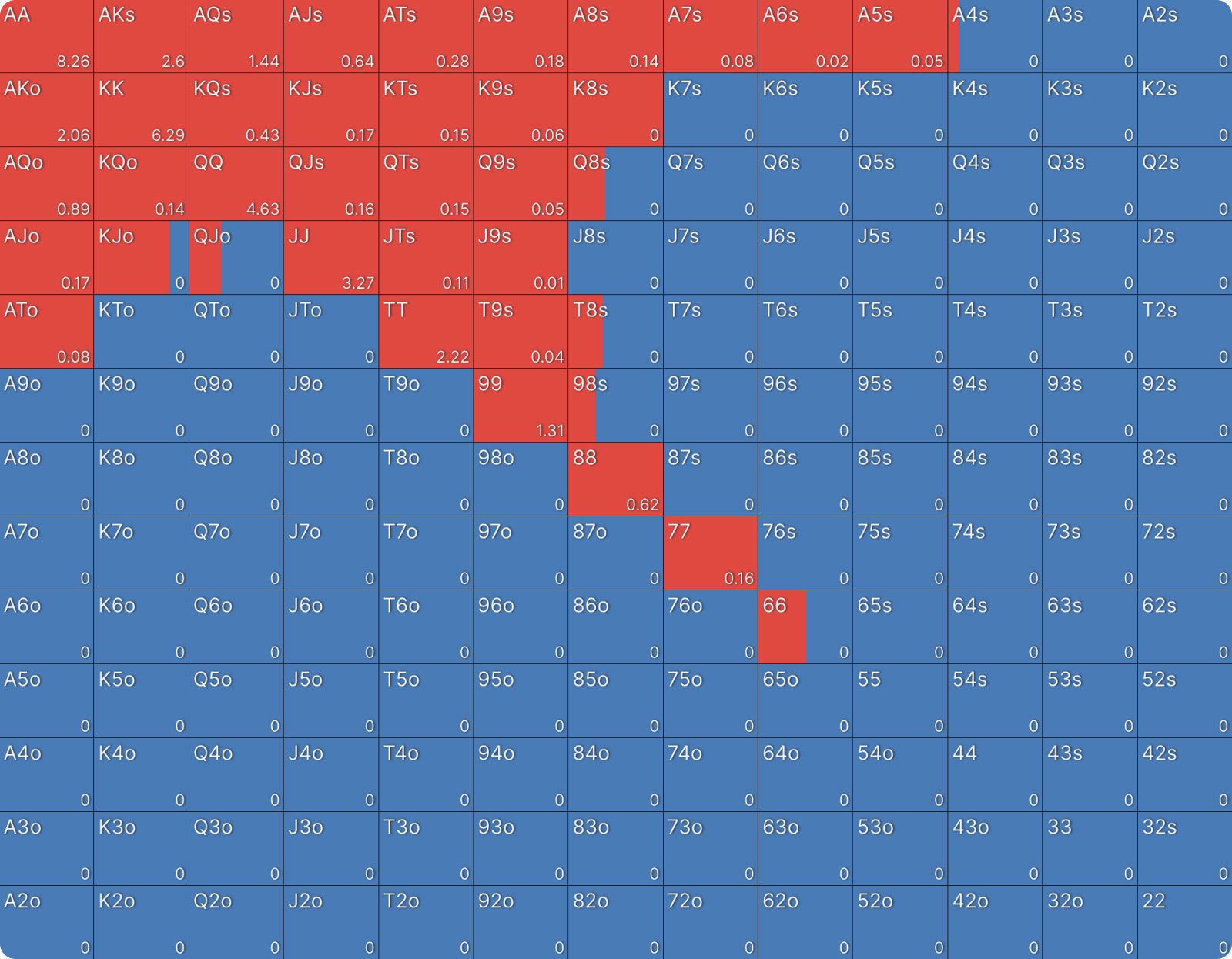 Диапазон пуша основан на чистом эквити руки, поэтому мелкие карманные пары вновь включаются в диапазон, а количество одномастных Кх уменьшается.