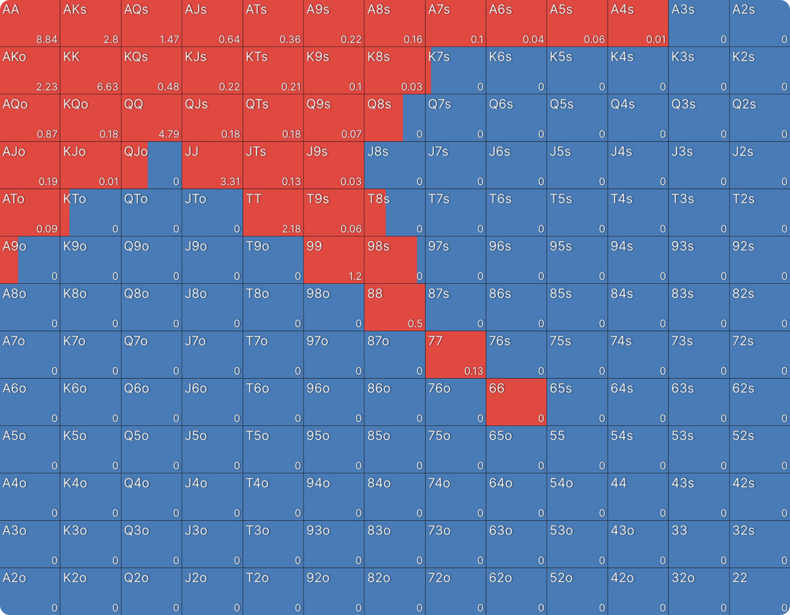 Стек в 20bb — это переломный момент, так как диапазон начинает сужаться. Самая слабая карманная пара, которую мы можем открывать, это 66. C 20bb количество одномастных комбинаций с высокими и низкими картами начинает уменьшаться. Например, A3s больше не открываются, K7s открываются с меньшим весом. В свою очередь, в диапазон добавляется комбинация А9о.