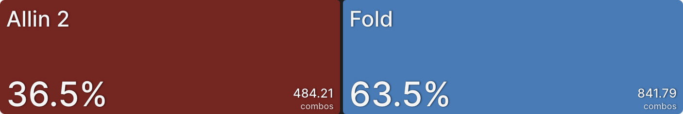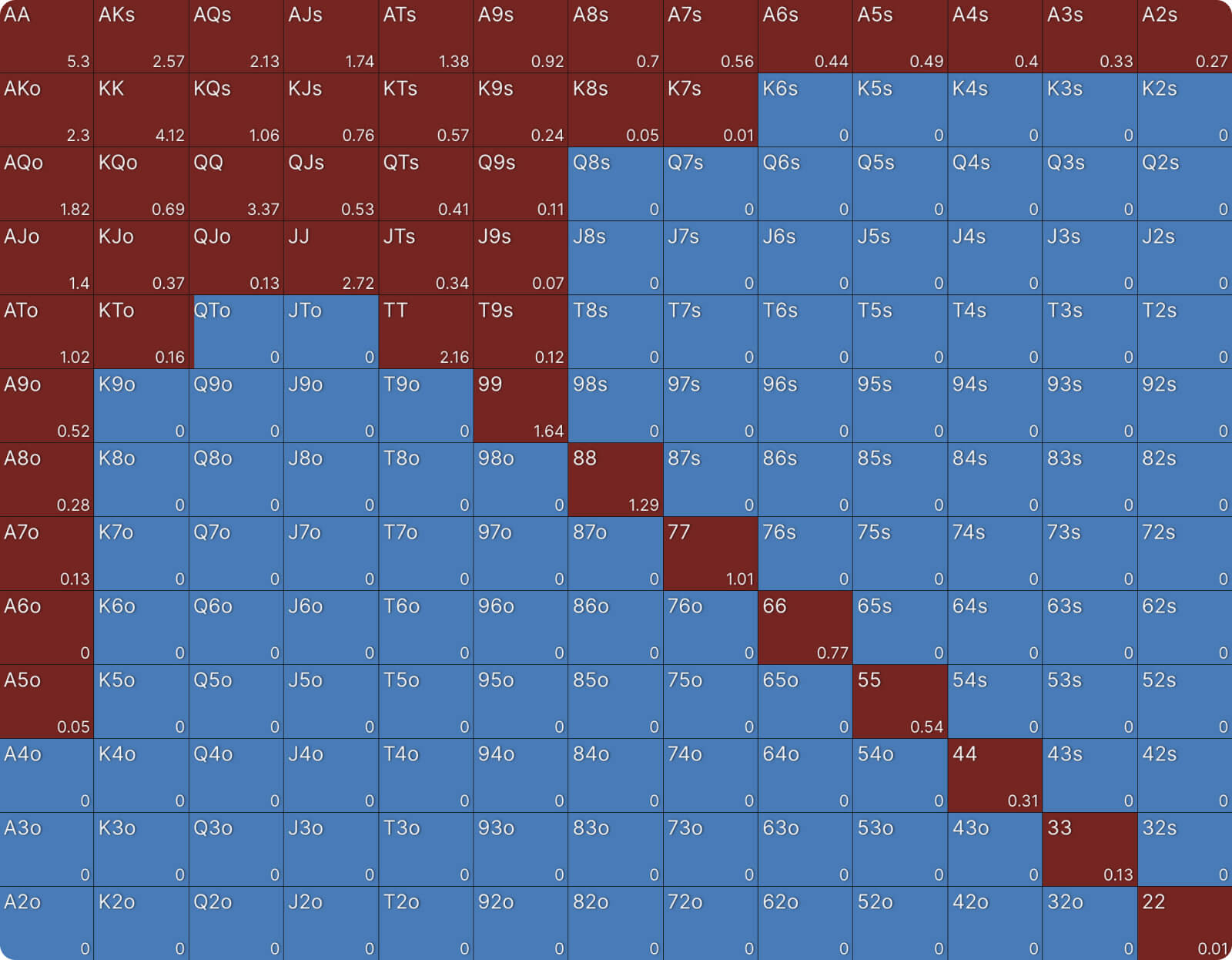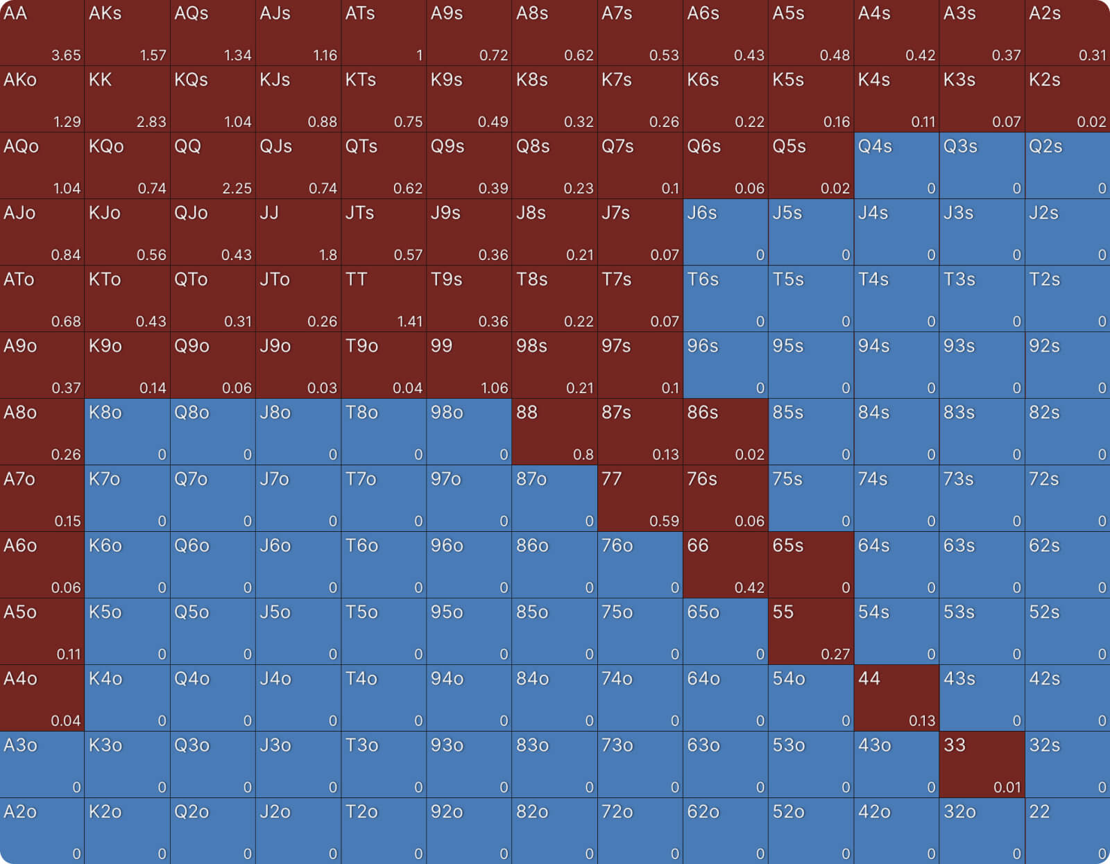 Мы пушим 36,5% рук. Для нас будет потрясающим результатом забрать банк на префлопе, но это редкость. Причина, почему наш диапазон так широк, — оппоненты тоже готовы закрывать нас широко. Например, игрок на BB должен коллировать с любыми двумя картами. Таким образом, 36,5% диапазон будет прибыльнее 100% диапазона колла на BB.