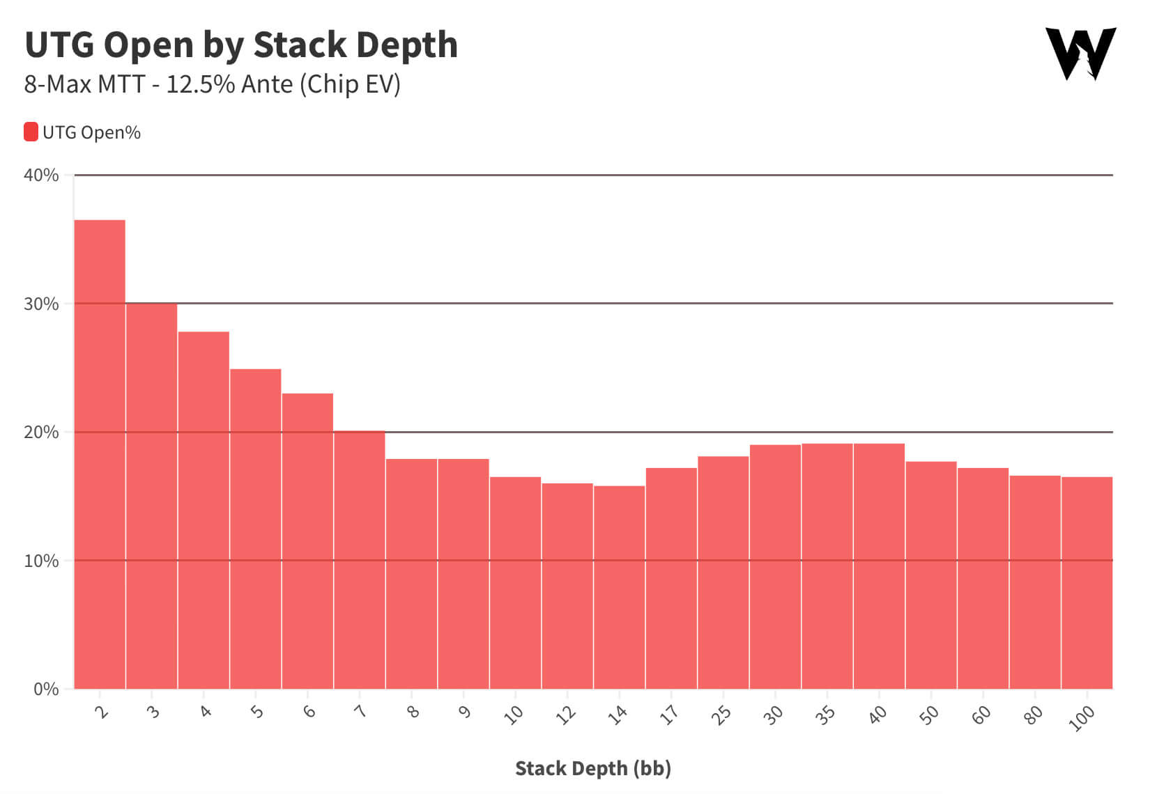 Возможно, неудивительно, что диапазон начинает сужаться в районе 35bb. Это самая сложная глубина стека для игры в МТТ — недостаточно глубокая, чтобы иметь много вариантов действий, но слишком короткая, чтобы упростить решения до пуш-фолда.