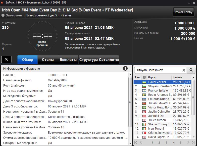 Главная фишка Main Event Irish Open заключалась в том, что турнир был максимально похож на офлайн-событие. Три стартовых флайта, три входных дня, уровни в первый день по 25 минут, во второй день по 30 минут, а за финальным столом по 40 минут. Павел пошутил, что не хватало только вечернего обеденного получасового перерыва. Возможно, его добавят к следующей серии, но это не точно.