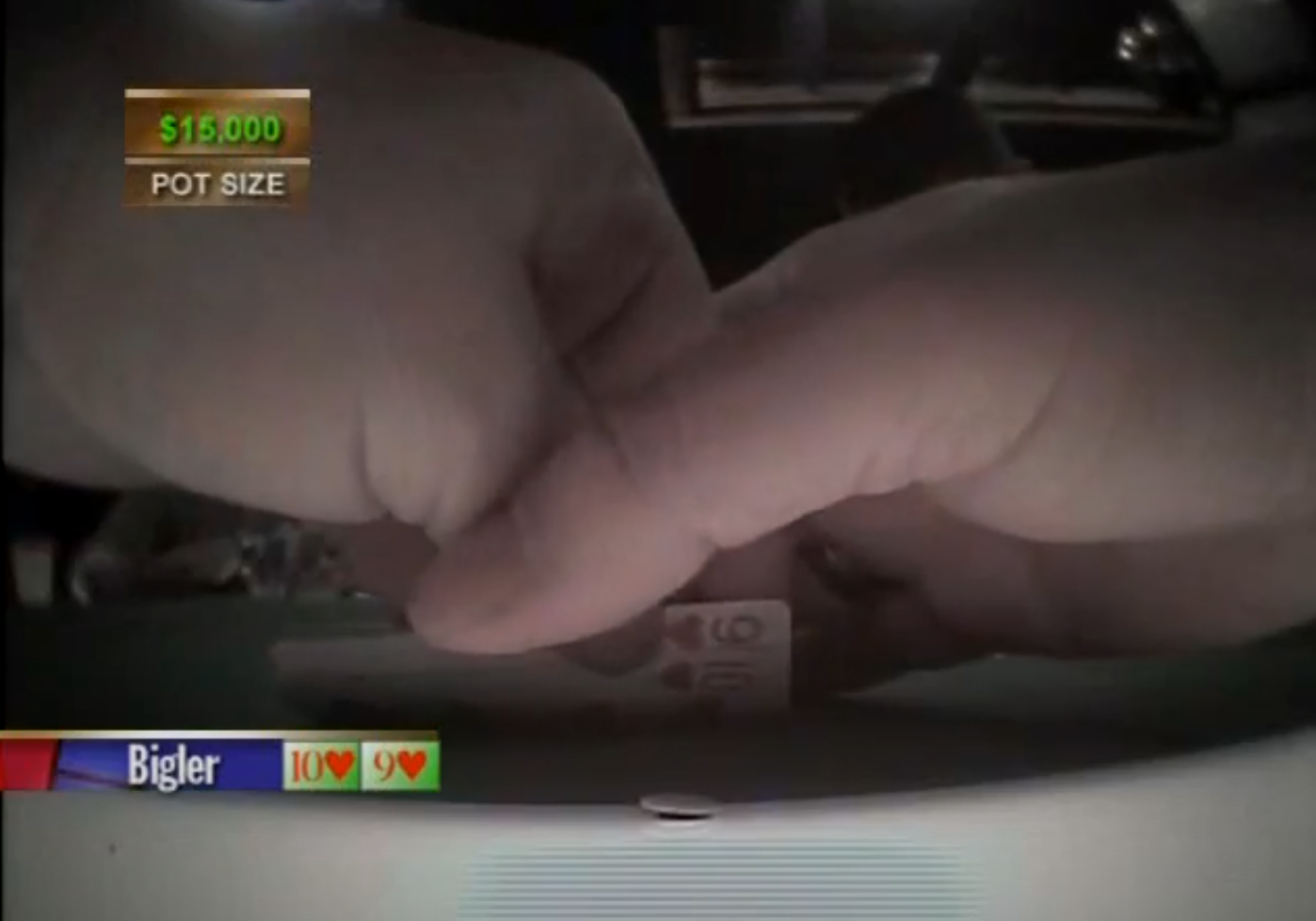 Известно, что для некоторых турниров их ставили на рейле или в бортике стола для захвата изображения карт, когда игроки проверяют их после получения. Например, вот так карты показывали на WPT Bellagio Five Diamond Poker Classic 2003.