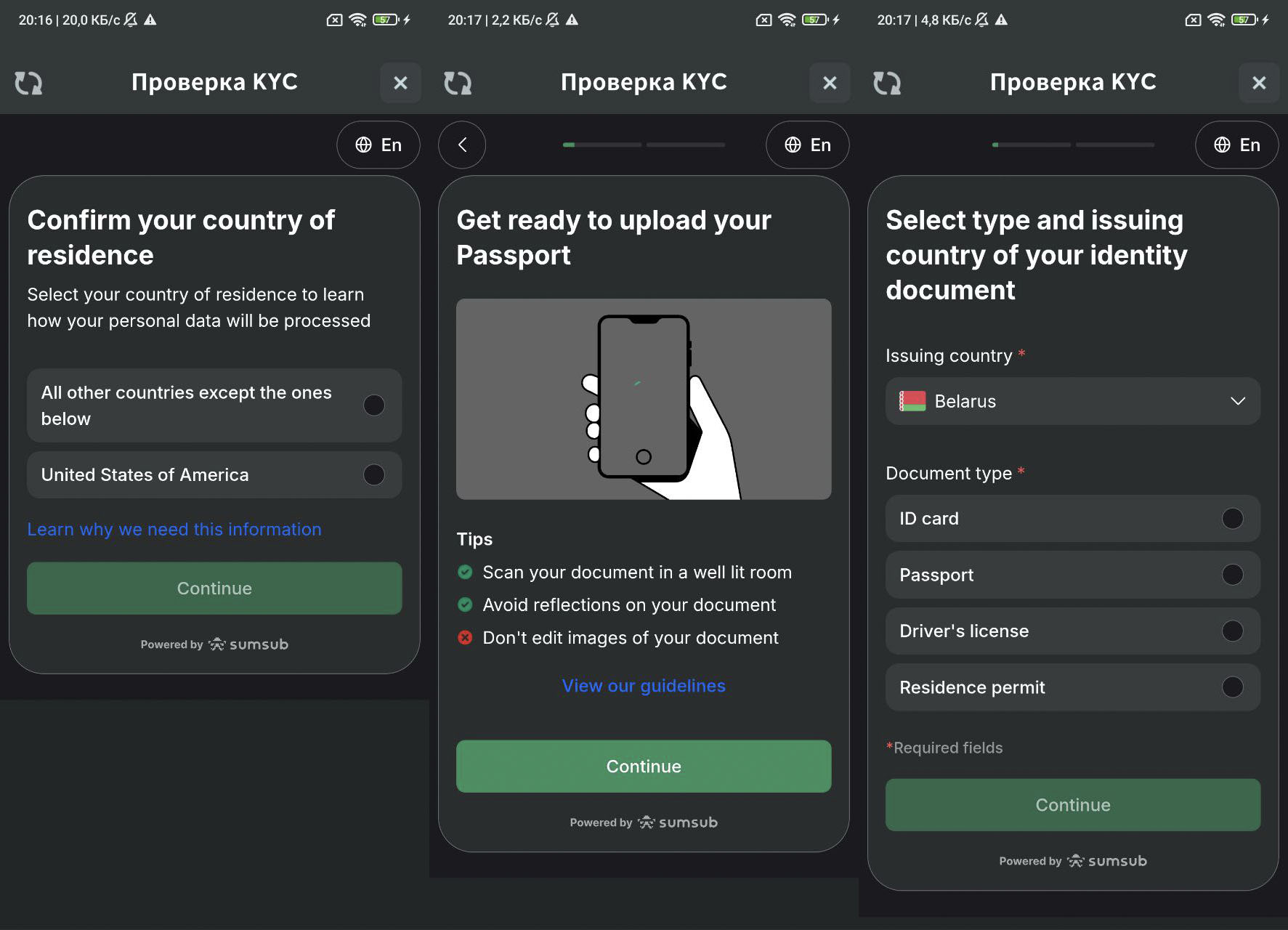 В следующем окне нужно выбрать вашу страну и тип документа, подтверждающего личность (ID-карту, паспорт, водительское удостоверение или ВНЖ). Выберите документ — нажмите "Continue".