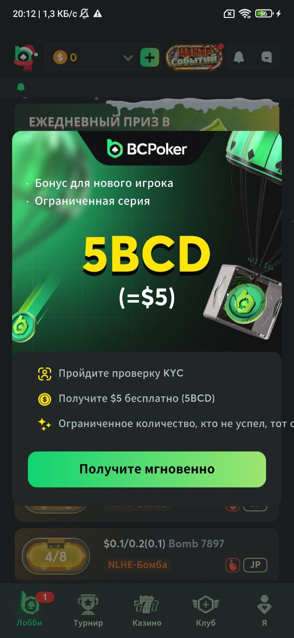 Как получить $5 без депозита на BCPoker