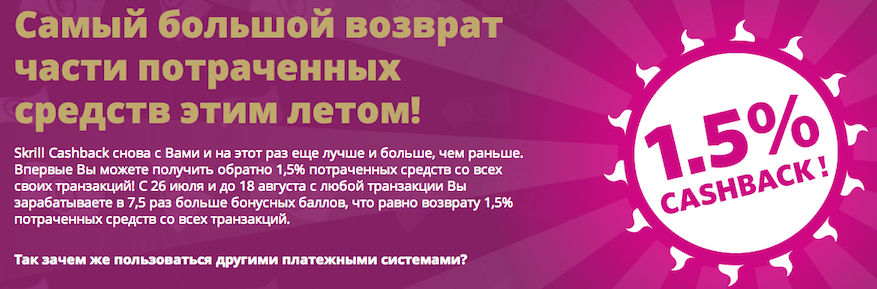 К примеру, можно воспользоваться моментом и получить кэшбэк в 1.5% делая депозит через Skrill. До 18 августа платежная система проводит промо, по которому бонусные баллы накапливаются в 7,5 раз быстрее. Благодаря этому получается возврат в 1.5%, который Skrill гордо называет привычным для покеристов словом "кэшбэк".