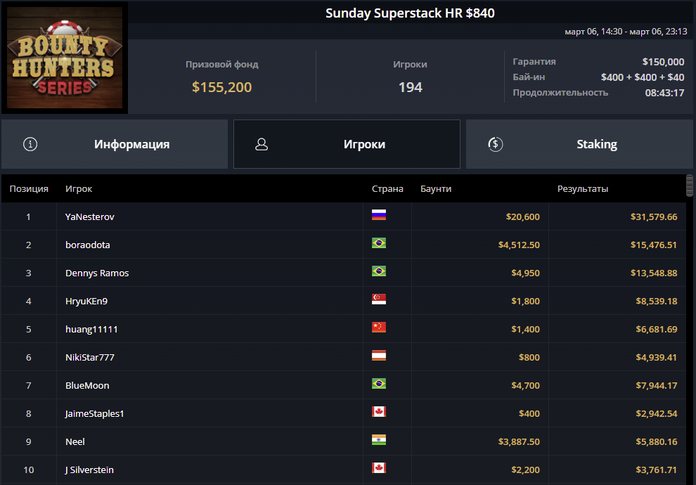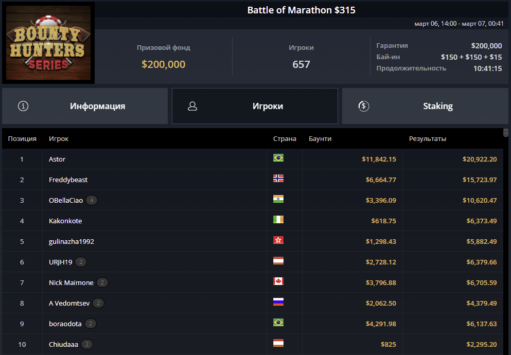 Это слегка неожиданно, так как трафик во всех онлайн покер-румах просел на 10%-20% за последние 11 дней. Среди пары десятков однодневных событий Bounty Hunters с бай-ином выше $100 в эту субботу и воскресенье оверлейными были лишь два: $315 Battle of Marathon и $630 Super Six HR. В обоих не добрали менее $10K.