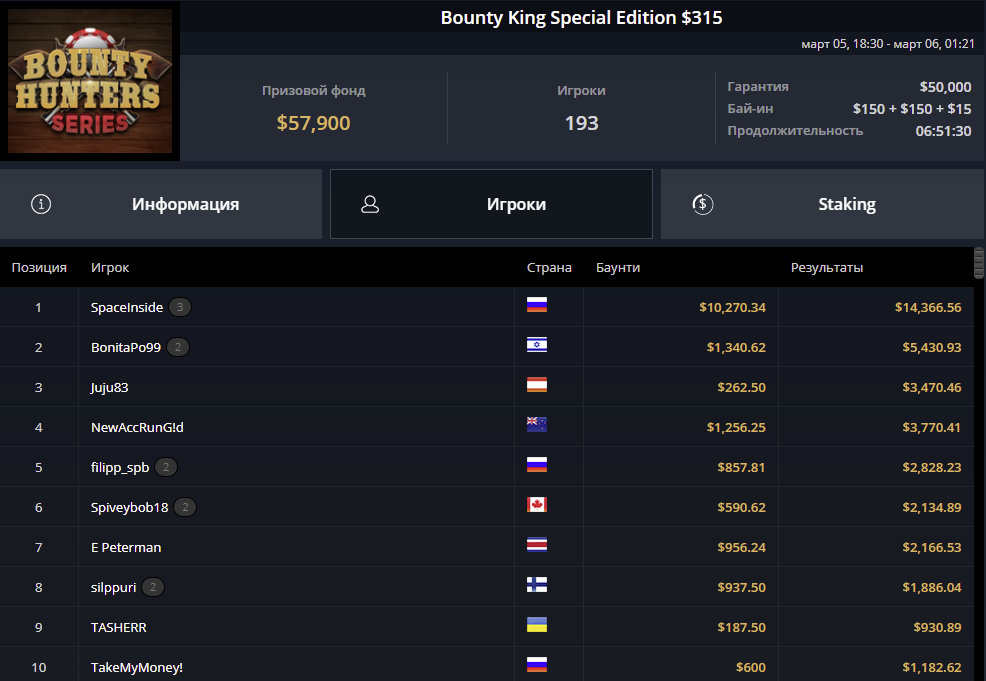 Spaceinside заработал $14K за победу в $315 Bounty King Special Edition. В декабре прошлого года у него был крупный занос на зимней серии WSOPC ($103K).