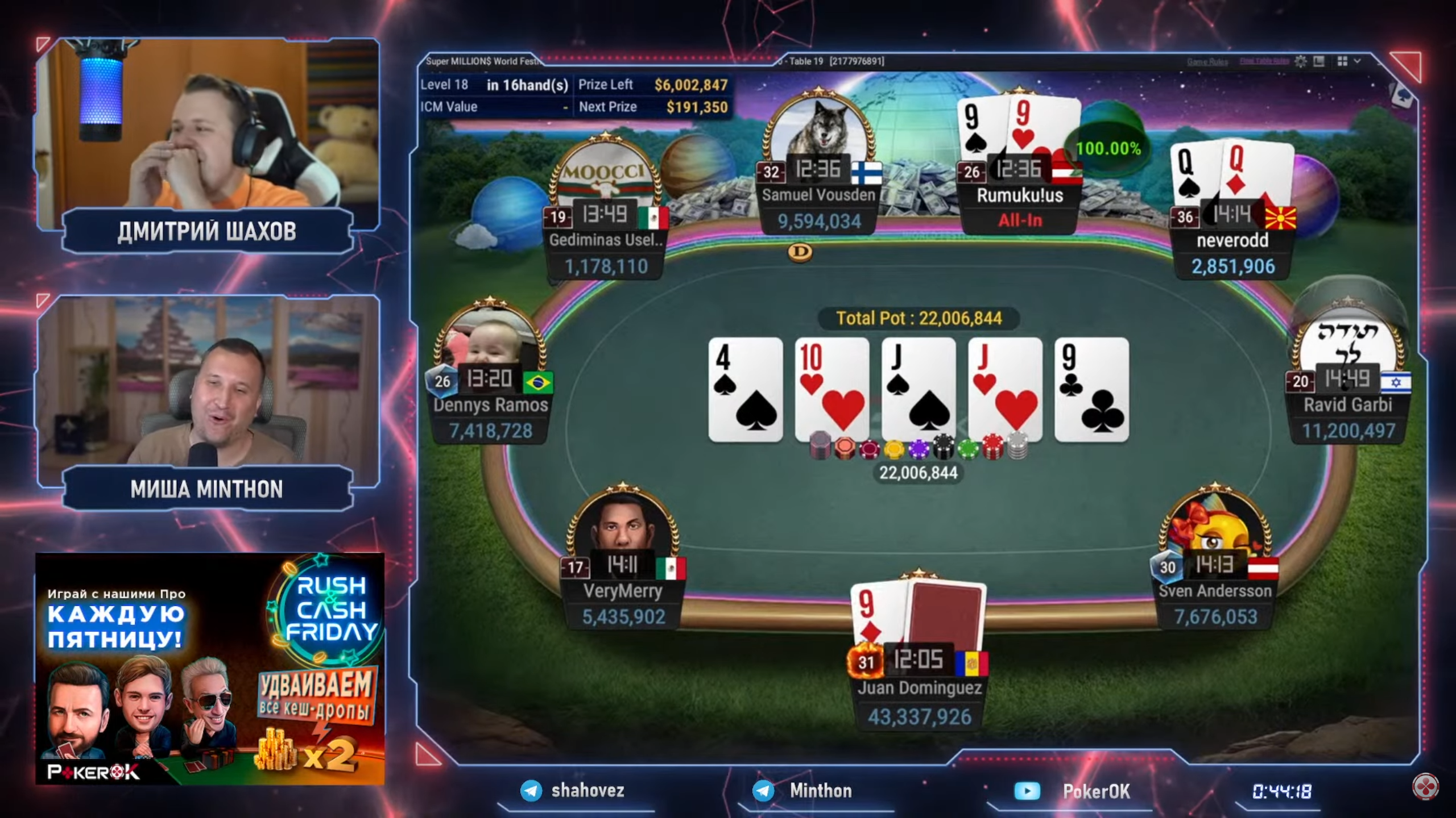 Сначала в 9-максе он выставился с 99 в QQ не зная, что Хуан Пардо Домингез сбросил на префлопе 9x. В итоге случилось чудо и австриец поймал на ривере 1 аут, получив второй стек за столом.