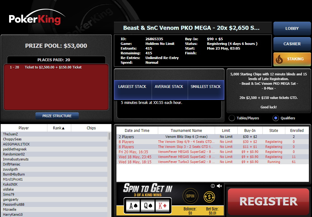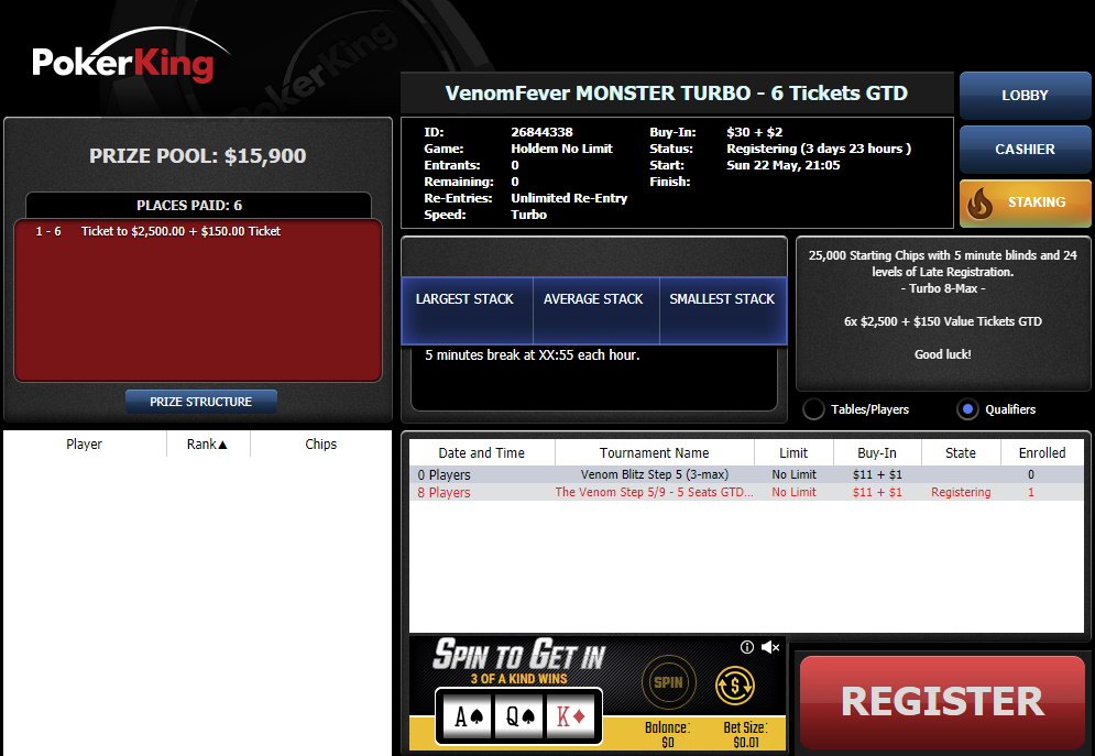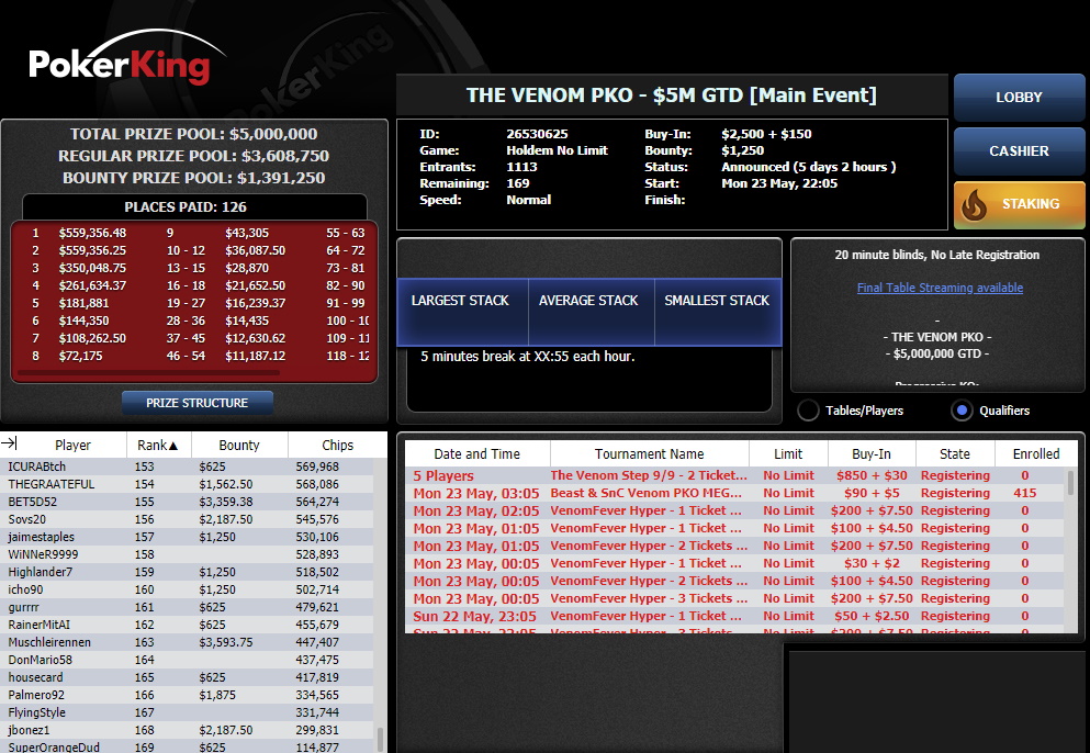 В прошлое воскресенье мы заметили новые турниры от $109 до $1050 на PokerKing — VenomSpecial. Сейчас в лобби их нет, но предпологаем, что мы увидим их в ближайшее воскресенье. Эти события наверняка будут проходить параллельно с флайтами The Venom PKO, чтобы хайроллерам было, что подгружать именно на PokerKing.