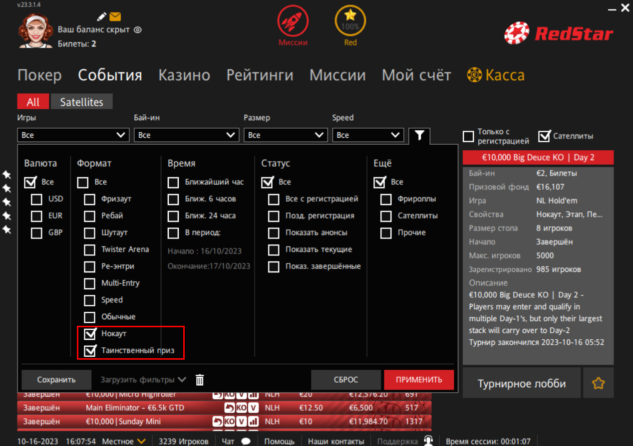 Третий — через фильтры, выбрав в столбце «Формат» варианты Нокаут и/или Таинственный приз.