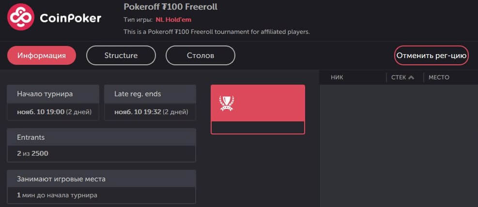 Зарегистрируйтесь на CoinPoker от Покерофф с бонус кодом POFF и получите доступ в еженедельный фриролл с призовым фондом $100.