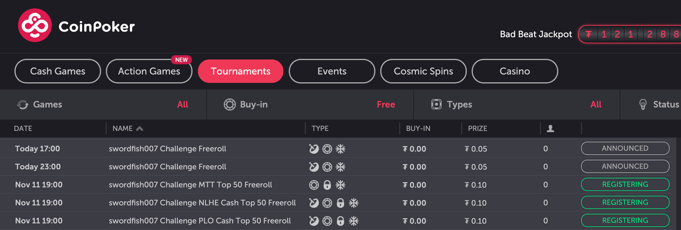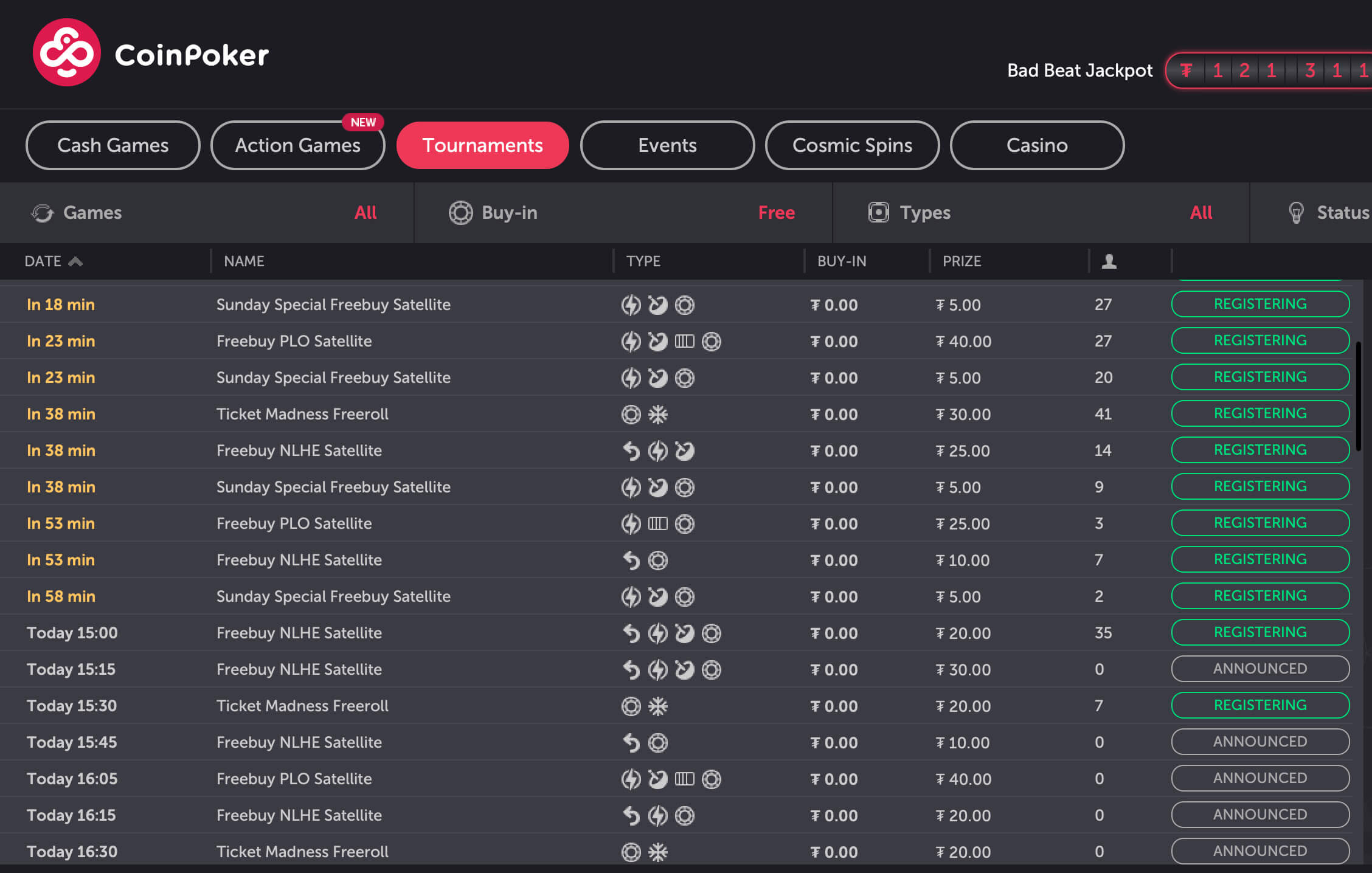 Также на CoinPoker ежедневно проходят несколько десятков фрироллов и фрибаев. Ищите их во вкладке Tournaments, используя фильтр Buy-In — Free.