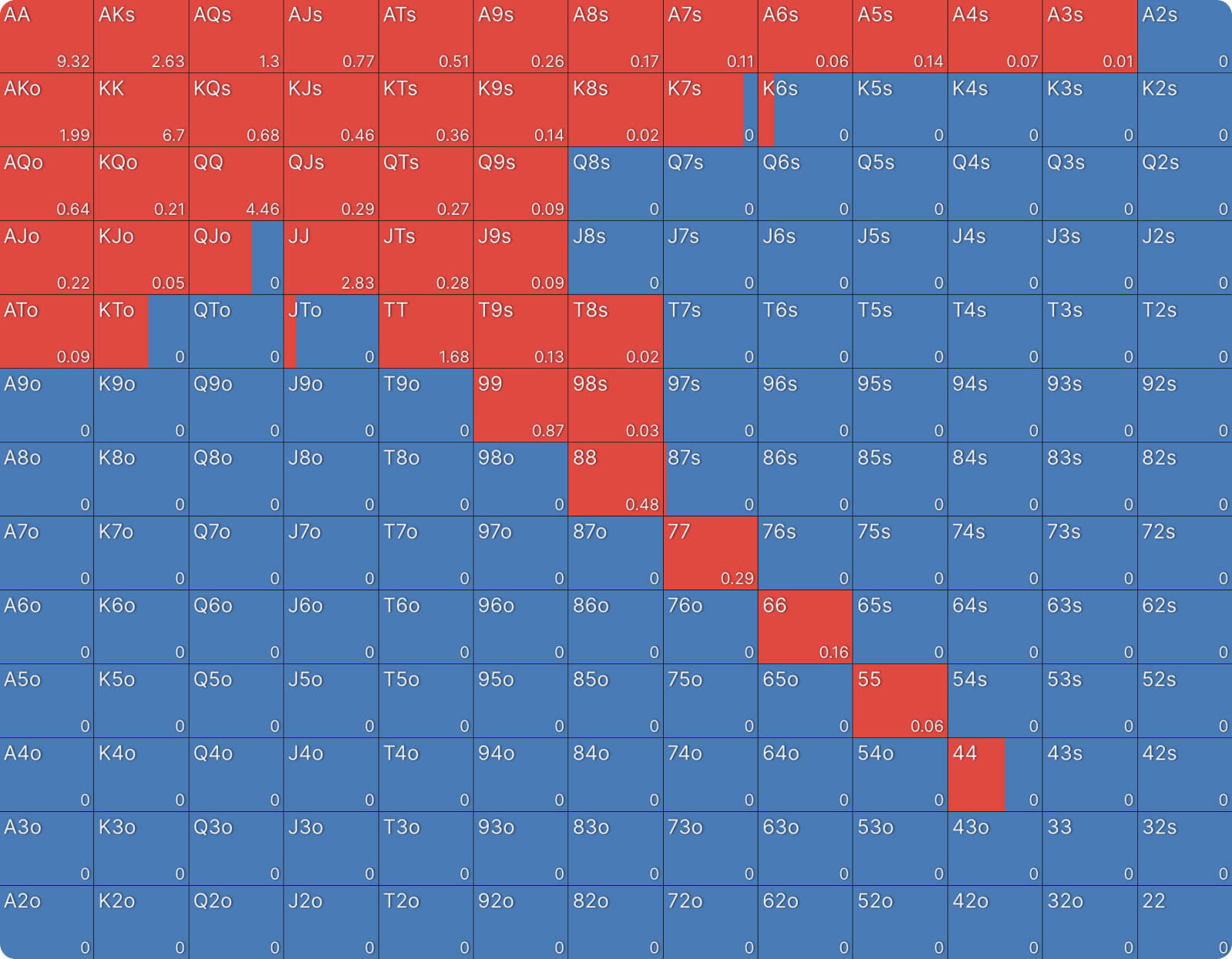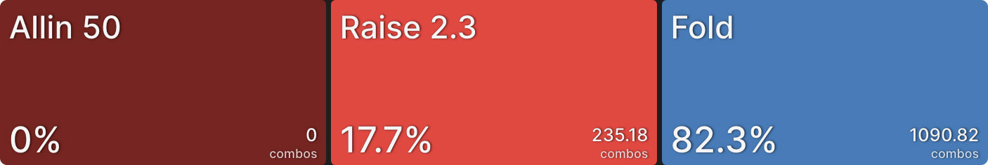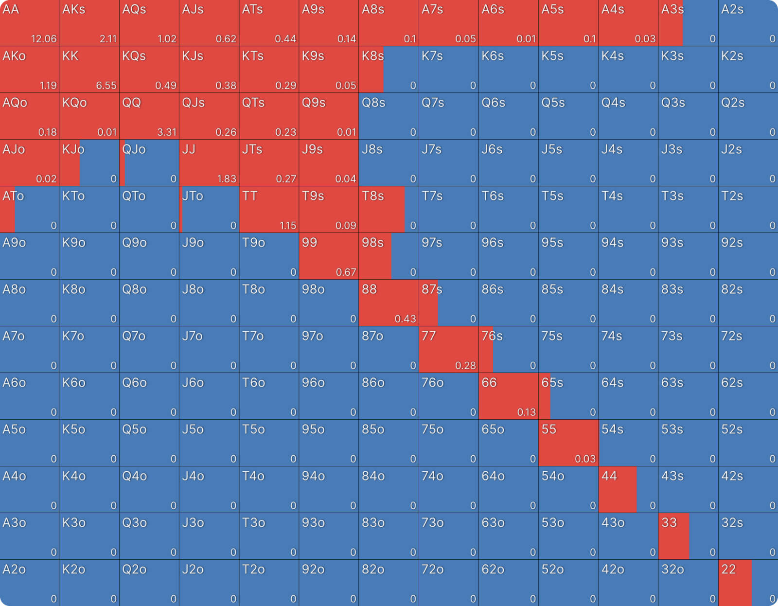 В глубине 50bb частота оупенов увеличилась за счёт бóльшего веса рук A3s, ATo, K8s, KJo и QJo. Также в диапазон добавились новые руки такие, как KTo, K7s, K6s. Для поддержания общей частоты оупена некоторые руки или полностью удаляются из диапазона (65, 76), или разыгрываются с меньшим весом (44, 33, 22). Все эти руки объединяет то, что в них есть низкие карты.