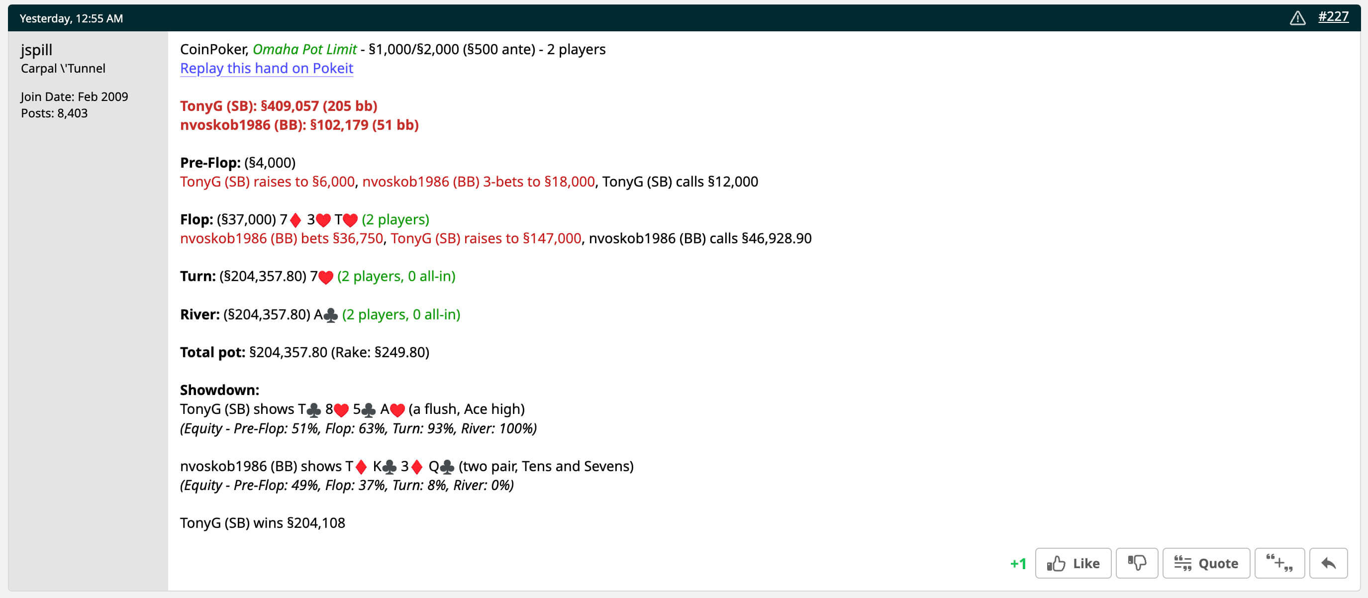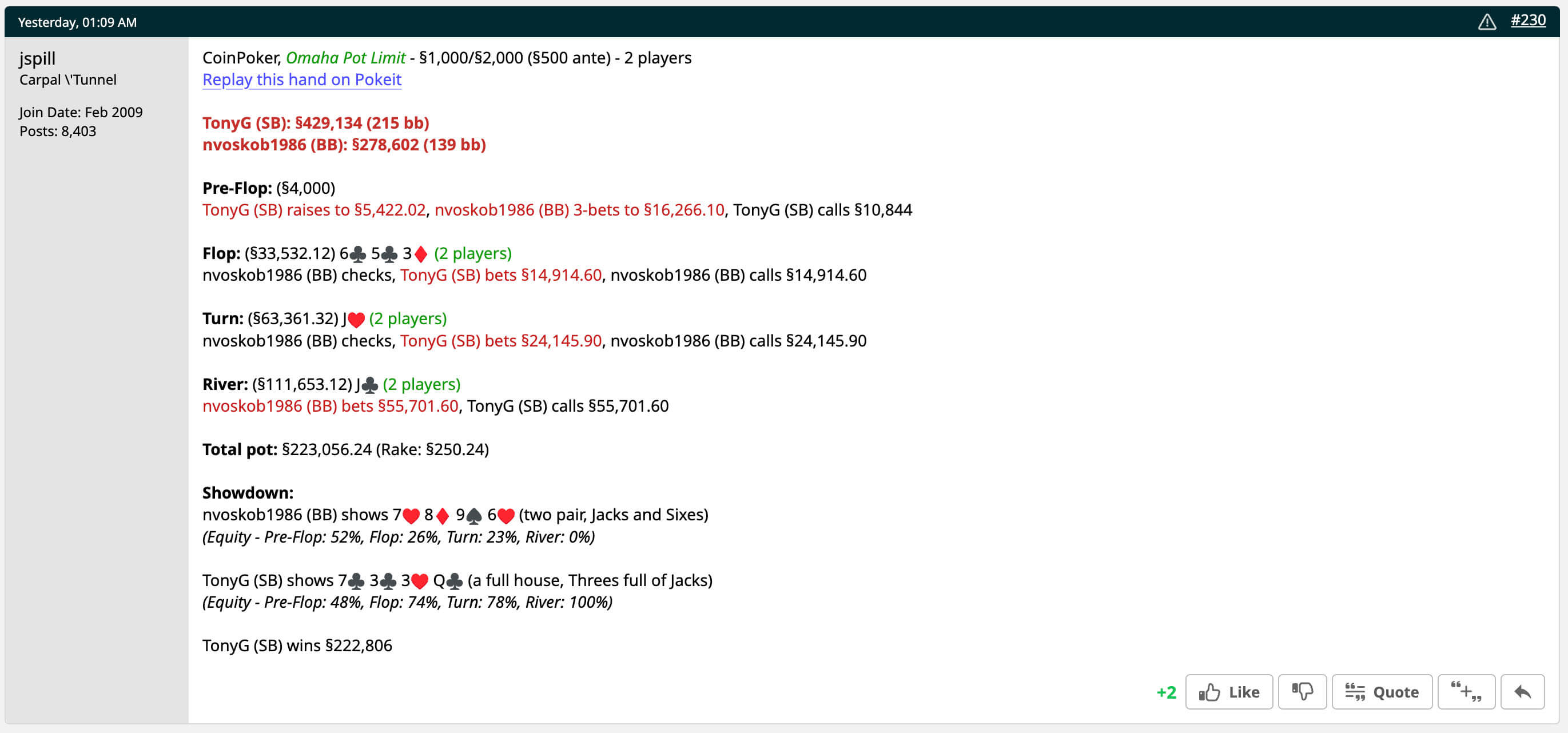 В итоге Tony G играл хедз-ап против Николая «nvoskob1986» Воскобойникова. В моменте стек Tony G превысил $500K.