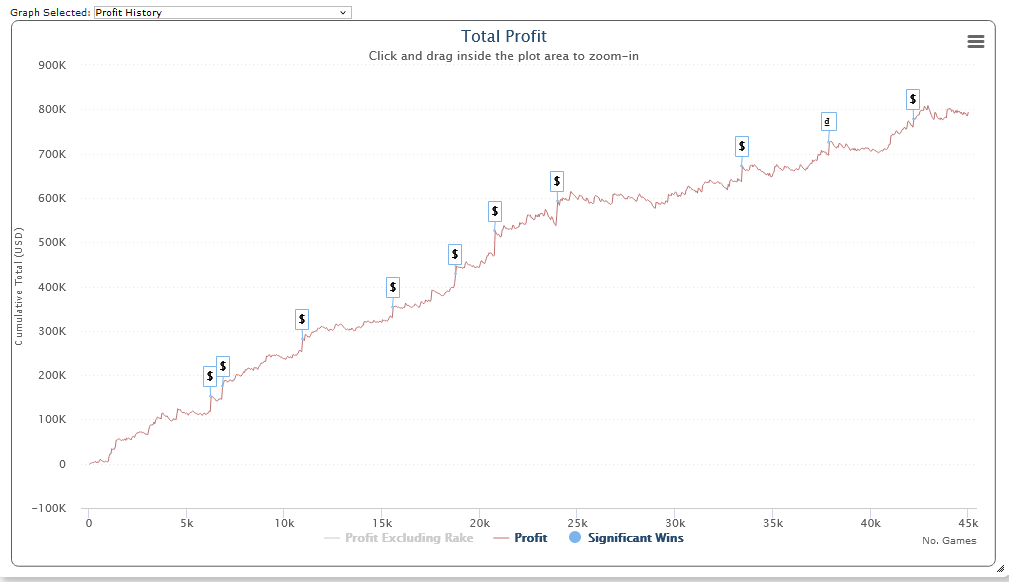 МТТ дисперсионны: поля большие, самые крупные выплаты достаются победителю. Графики даже успешных игроков часто выглядят так: огромный занос — проигрыш нескольких турниров — огромный занос — снова проигрыш нескольких турниров и т.д. Часто крупные заносы составляют бóльшую часть профита. В некоторых случаях такие заносы затмевают весь остальной график. На мой взгляд, так быть не должно.