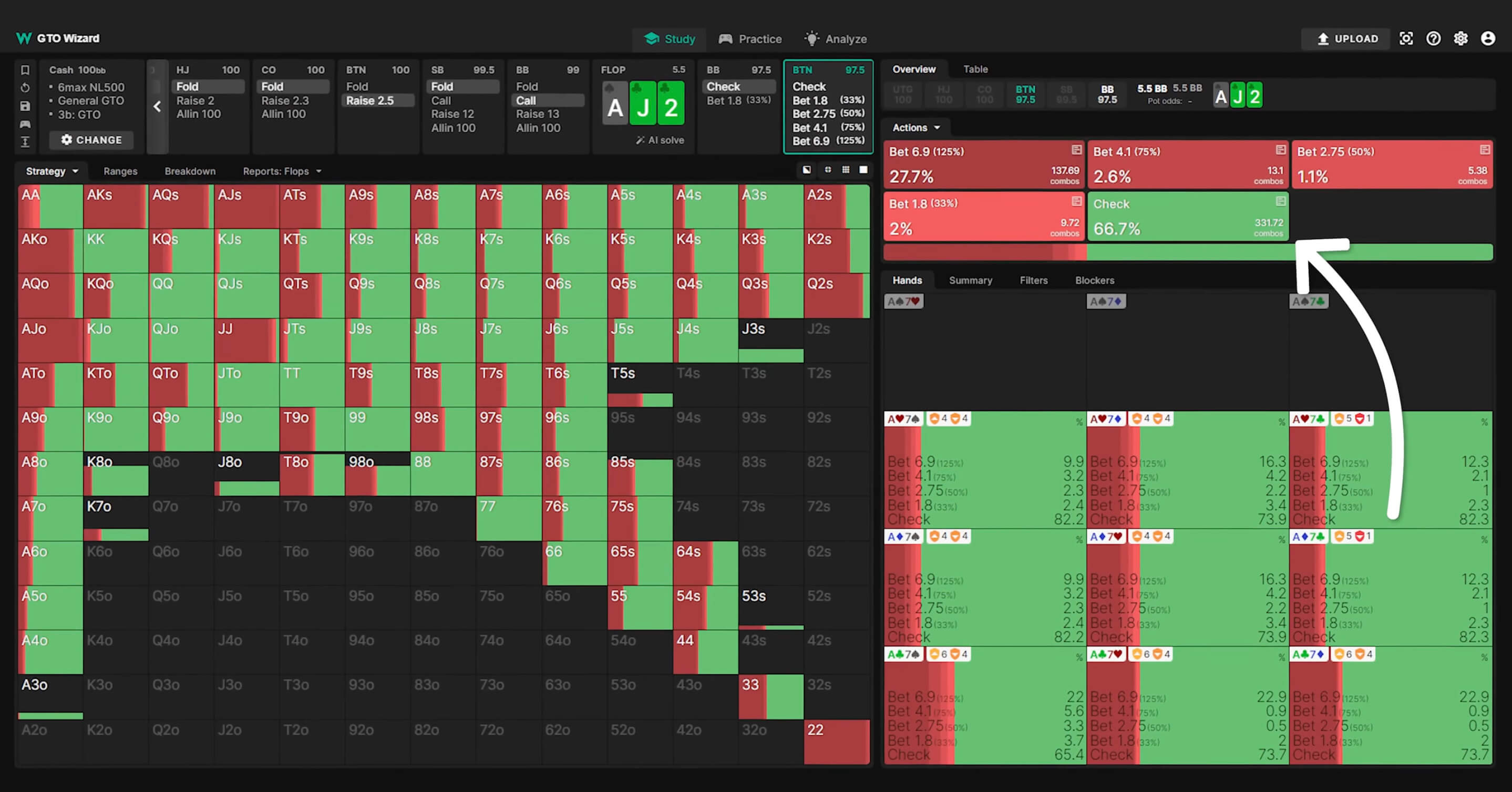 Или, например, на флопах с тузом многие игроки привыкли делать продолженную ставку со всем своим диапазон, хотя на самом деле в этой ситуации большинство рук солвер рекомендует разыгрывать через чек.