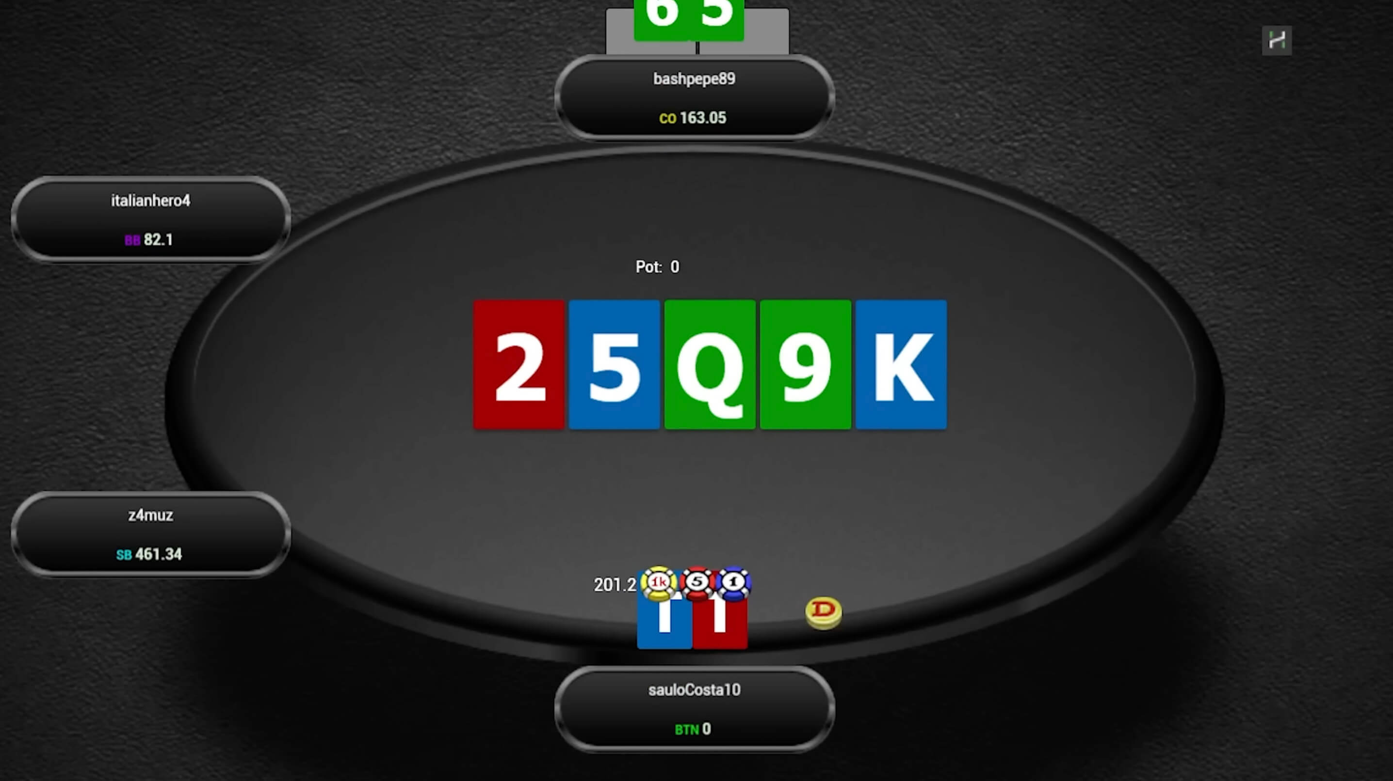 Или вот другая раздача. Я сделал ставку на флопе, сыграл чек-колл на тёрне и заколлировал ставку на ривере по А-хай.