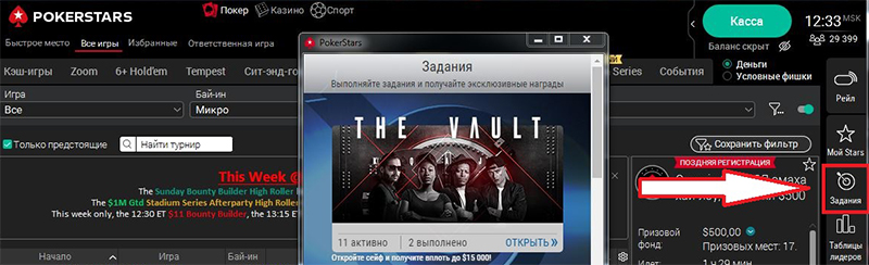 С 10 по 30 августа игроки PokerStars могут заработать часть из призового фонда в $1.000.000 в акции «The Vault» («Сейф»). Для участия в акции необходимо зарегистрироваться в лобби рума в разделе «Задания» — «The Vault».