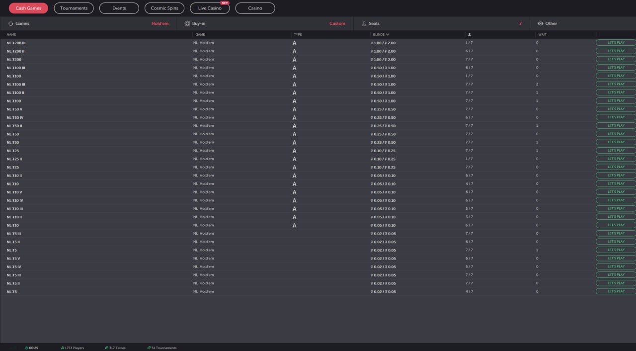 По данным менеджера рума, наибольший объём игры приходится на Cosmic Spins с бай-инами $0,25; $3; $5 и $10: по 100 турниров в сутки. Пик активности — после 23:00 МСК.