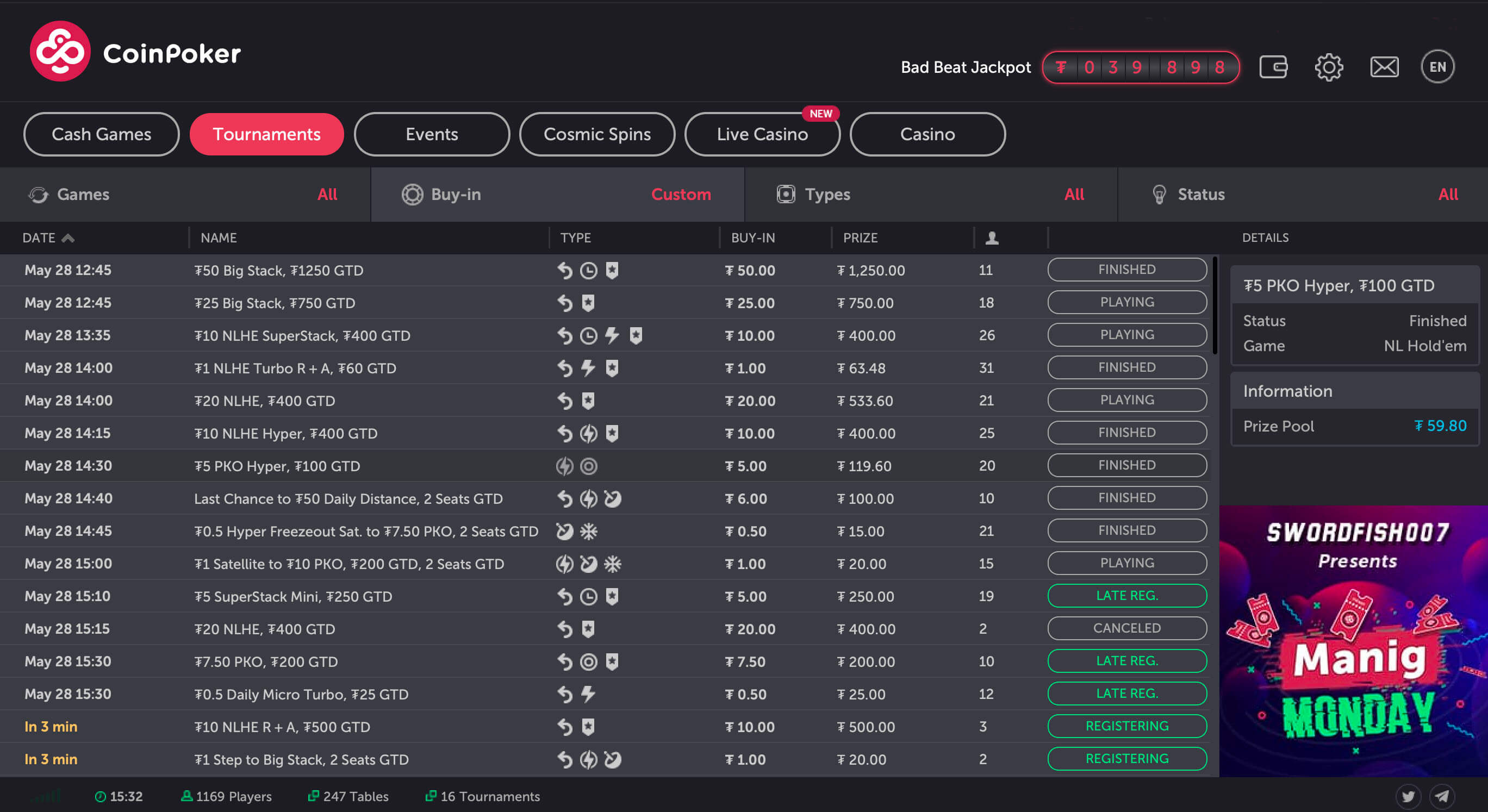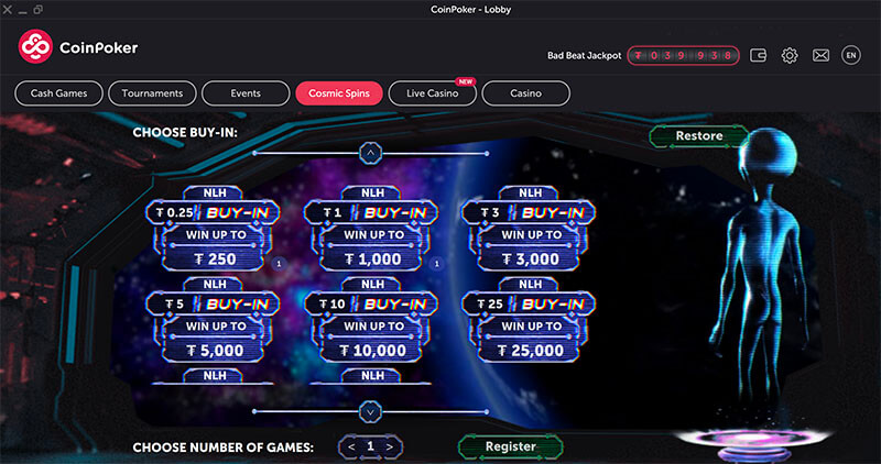 - Понедельник и вторник не пиковые дни на CoinPoker. Наибольшая игра собирается здесь в середине рабочей недели и в воскресенье.