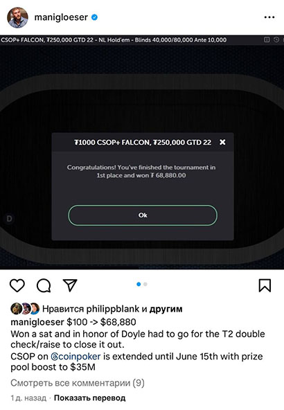К сожалению, CoinPoker быстро удаляет завершенные турниры из лобби. Но известные игроки делятся своими заносами в соцсетях.