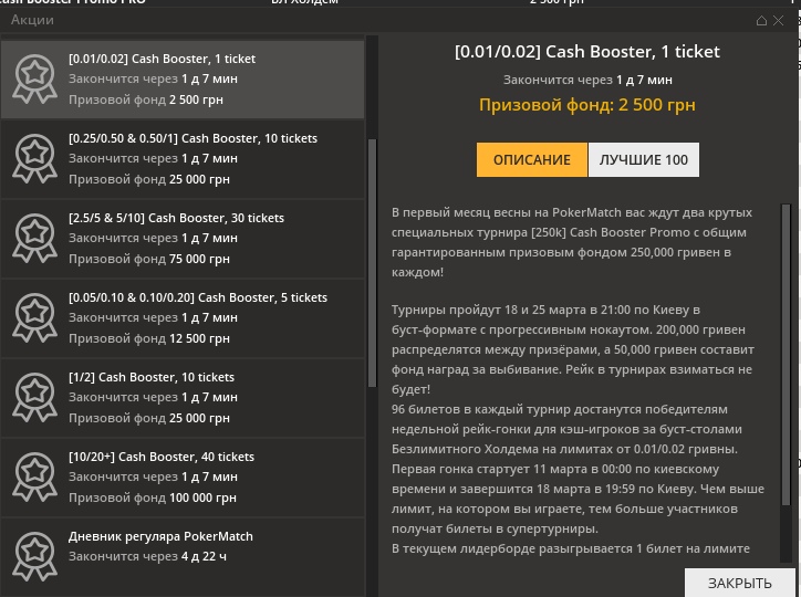 В зависимости от лимита столов различается ТОП, получающий призы — билеты на турнир ₴2,500 Cash Booster Promo с гарантией ₴250K (примерно $9,425):