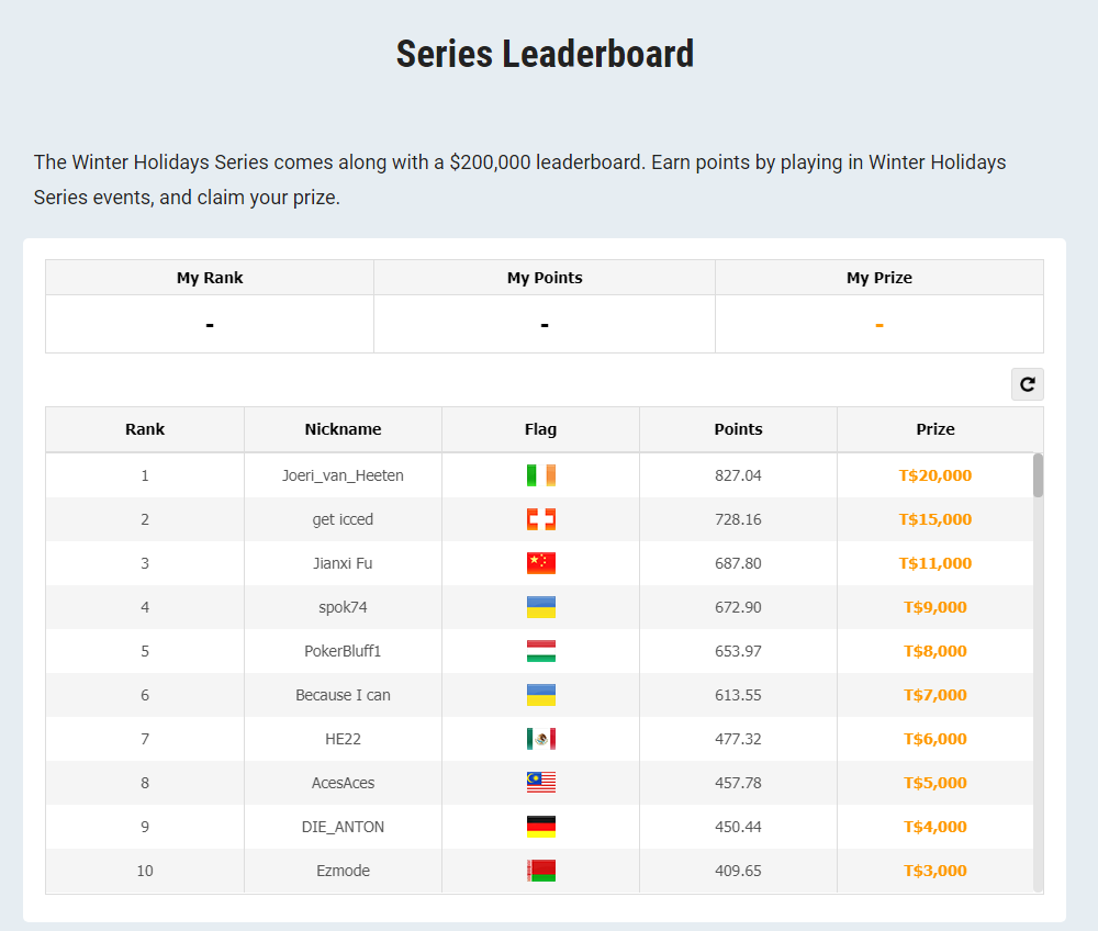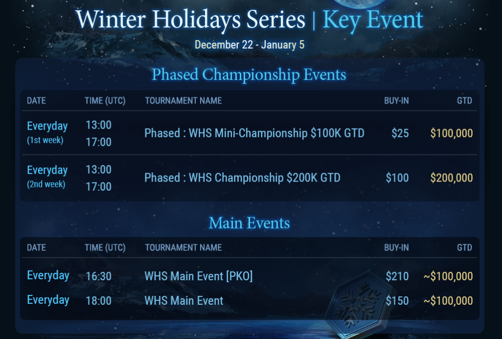 Winter Holidays Series польностью покрывает новогодние праздники, так что тем, кто решил обойтись без отдыха, будет чем заняться. Регистрируйтесь на GGPokerOK и не забывайте подписываться на @pokeroffru в телеграме.