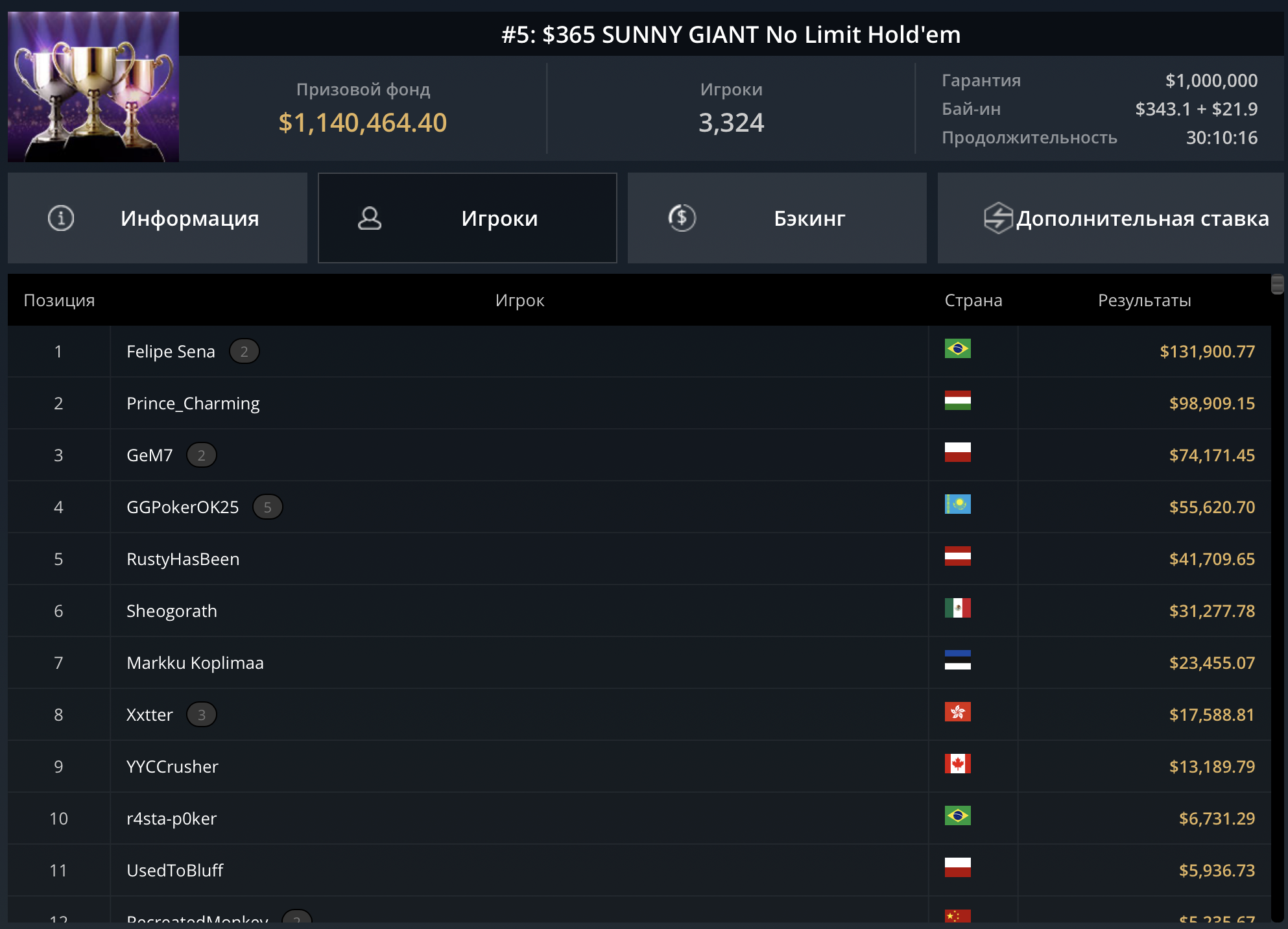 Бразилец одержал победу в $365 SUNNY GIANT ($132K).