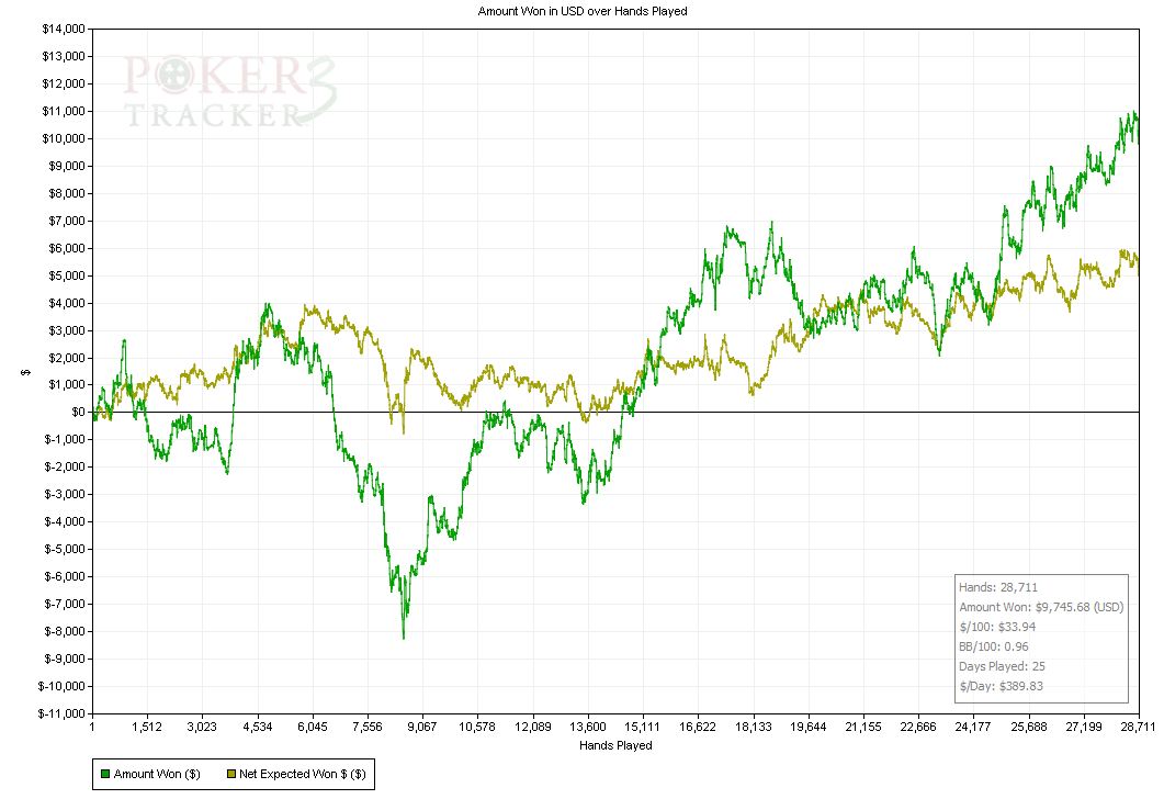 Что касается катки, то в этом месяце я обновил свой рекорд по числу рук, сыгранных за месяц. Обновил формально по сравнению в январем (28,7к против 28,6к), но учитывая, что nl600 не играл в принципе, вполне.