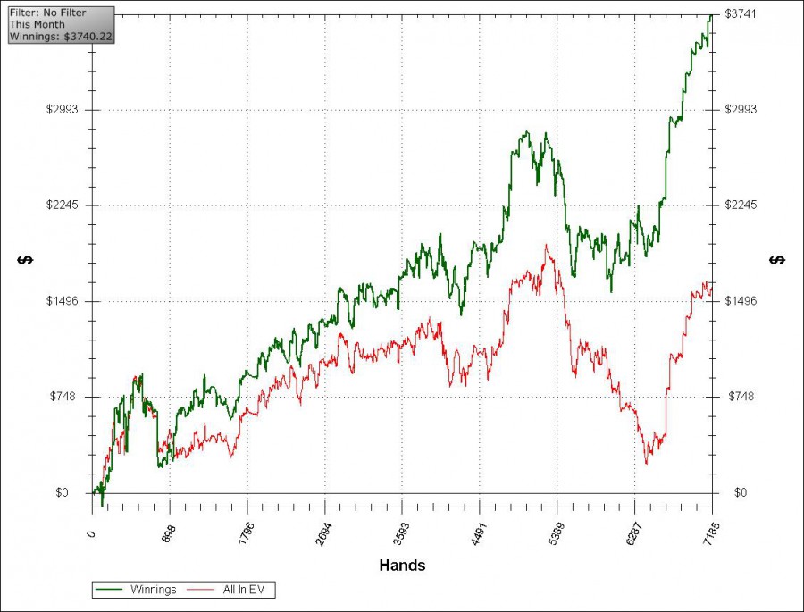 80к-87к Потом был отдых пару недель и после отдыха сначала позанимался с тренером, потом сразу отыграл самую свою плюсовую ( на то время ) сессию +$870. После нее, правда, я впал в эйфорию и половину проиграл довольно бестолково = ) Хотя, надо отдать должное – вышел при -5би и походил по комнате, собрался с мыслями, вместо того, чтобы тильтовать. Следующие сессии этого месяца почти все были плюсовые, кроме, пожалуй, самой последней, которая побила все рекорды : Началась с -12би в хедсап ( самый большой минус ) После перерыва наиграл +200 в хедсап и + 1900 в 6макс ( самый большой плюс за сессию ), при этом умудрившись перебрать примерно 1к = )