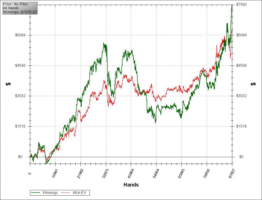 На этом графике я прошел путь от 25пло до 100пло за 87к рук, коротко опишу как: 0-5к рук играл 25пло, начав с банкрола в 600 долларов, довольно быстро набил до 1500 и пошел играть 50пло хедсапы = )