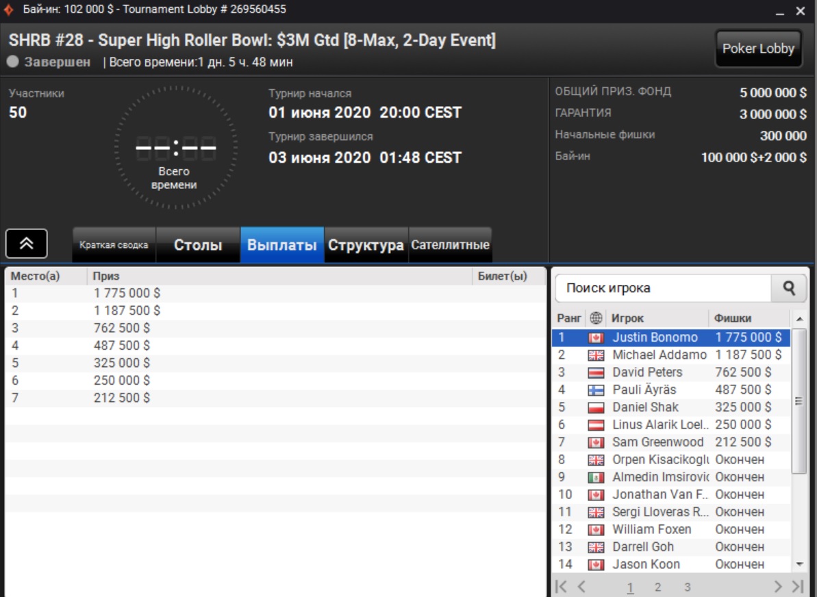 Главное событие под порядковым номером #28 в итоге собрало ровно 50 входов, что позволило поднять гарантию в $3kk до пяти миллионов. Очевидно, турниру было бы по зубам перебить её и более, чем в 2 раза, если бы не желание организаторов защитить единичных любителей фризаут-форматом.