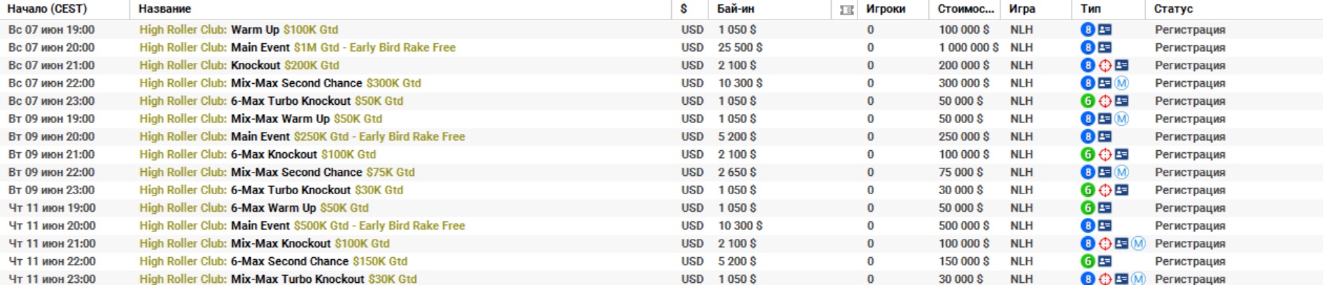 Что ж, для тех хайроллеров, которым по велению дисперсии было суждено оказаться спонсорами всего чемпионата, был оперативно организован High Roller Club. Начиная с этого воскресенья на partypoker будут проходить ивенты с бай-инами от $1k до $25k в регулярном формате: