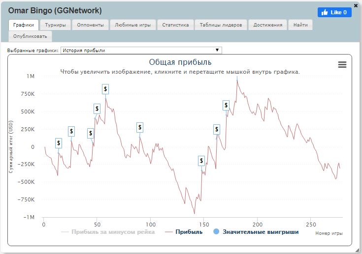 Заглянем на GG Network, где «Trueteller» играет под ником «Omar Bingo» и видим график с итогом -$200.000.