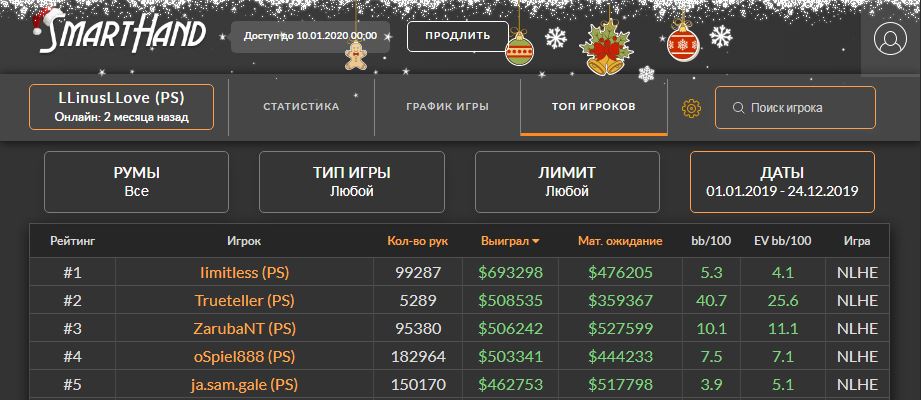 Вместо бесконечного пролистывания раздач с заоблачных лимитов, которые публикуют другие игроки на форумах, мы воспользовались сервисом Smart Hand. Выставили промежуток с 1 января 2019 по сегодняшний день — и вуаля, выборка перед нами.